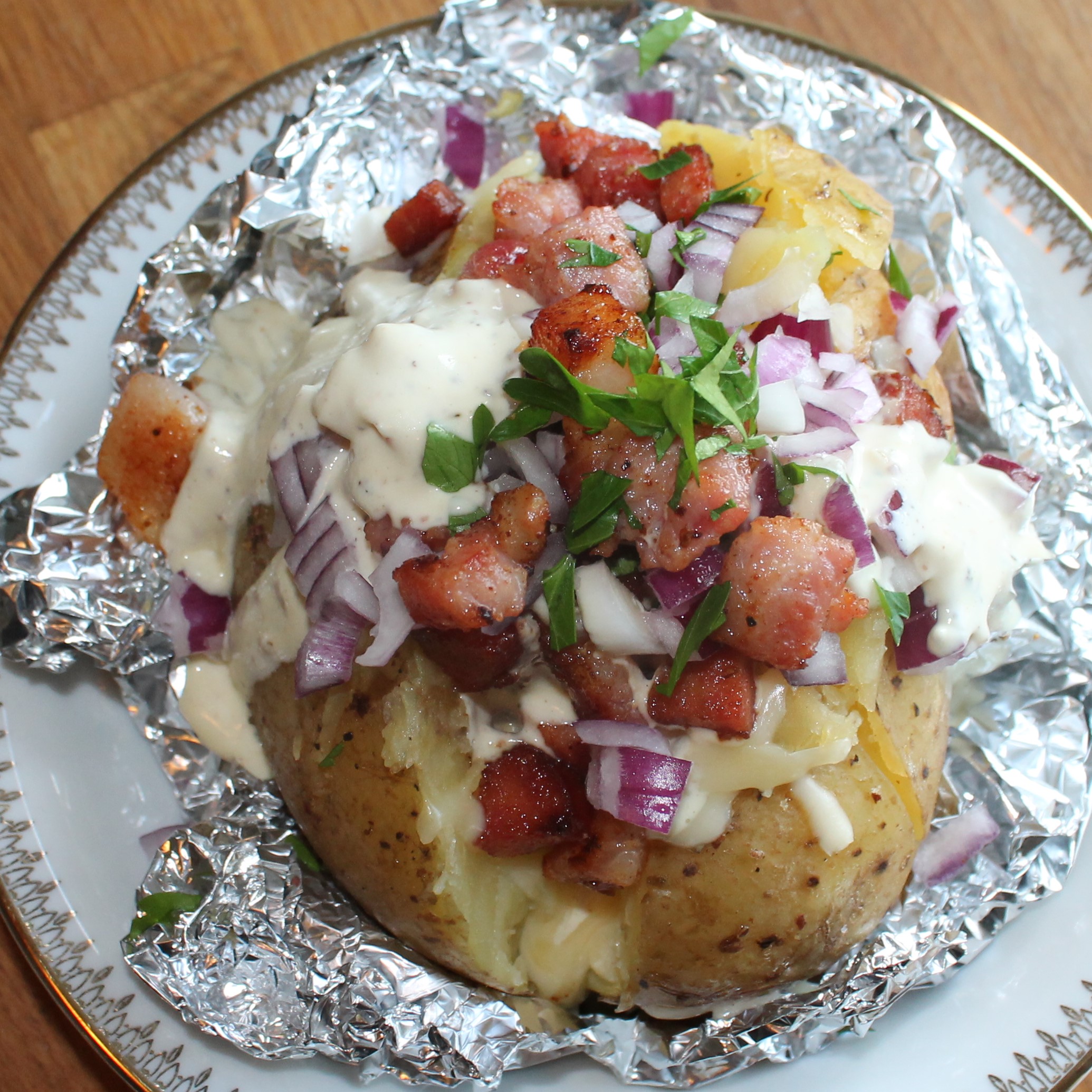 Tenk «bakt potet» og fyll den med det du selv liker. Jeg valgte bacon, chorizo pølse og varm ostesaus. I tillegg hadde jeg finhakket rå løk og gran pedano på toppen. Som alternativ til potet har sellerirot lavt innhold av karbohydrater og smaker veldig godt.
