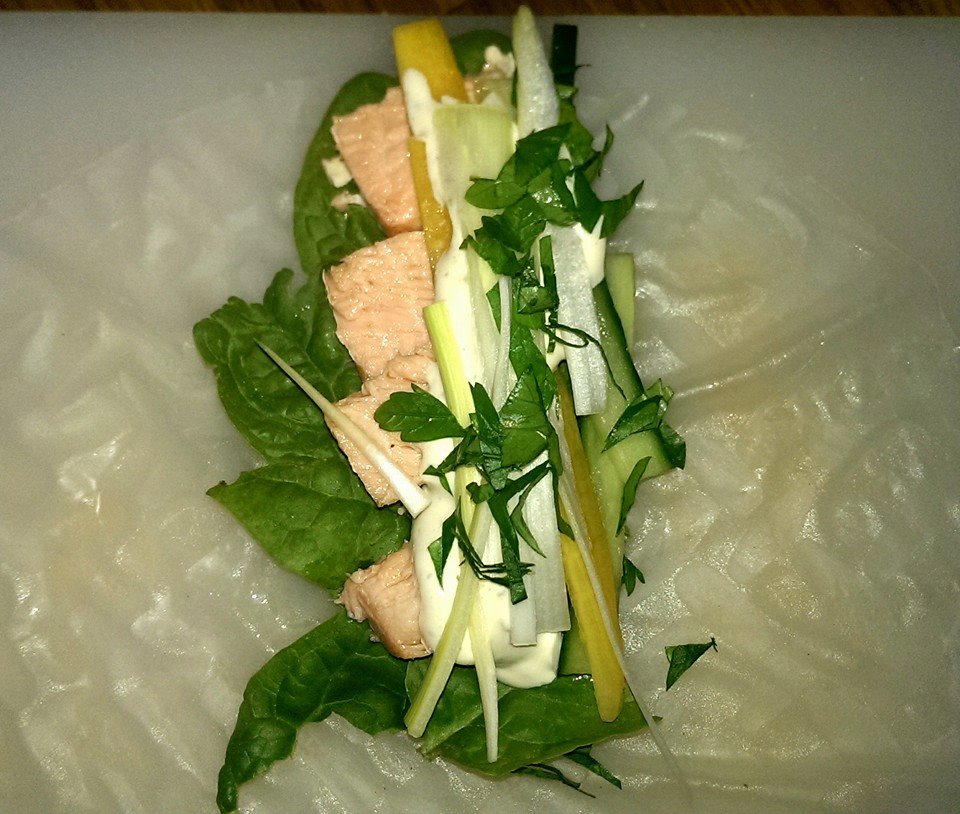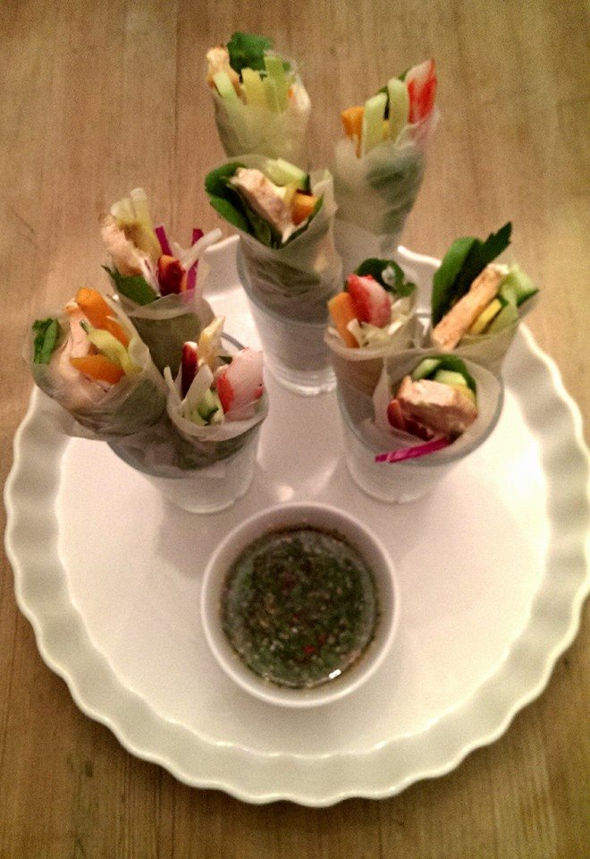 Vårrullene er fylt med stekt kyllingfilet, mango, rødløk, purre, agurk, salat og chilimajones.