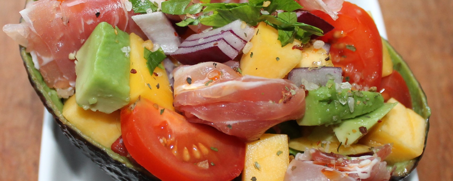 Det andre halvdelen ble italiensk og fylt med 2 skiver Parma, 1 salatblad + 1 cherry tomat + 1 skive rødløk + 1 avokadobåt + 1 mangobåt hvor alt er finhakket.