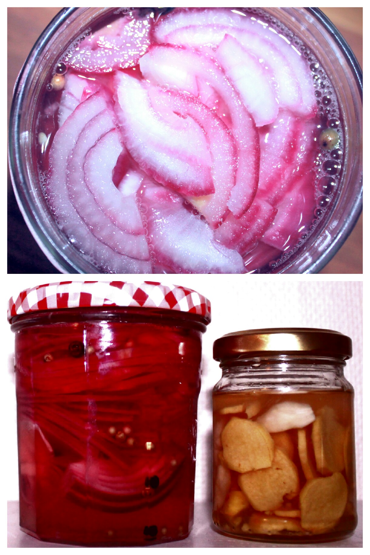 Kok opp vann, eddik og sukker. Tilsett salt og pepperkorn og hell over den oppskjærte rødløken. Oppbevares på tett krukke/glass i kjøleskapet.
