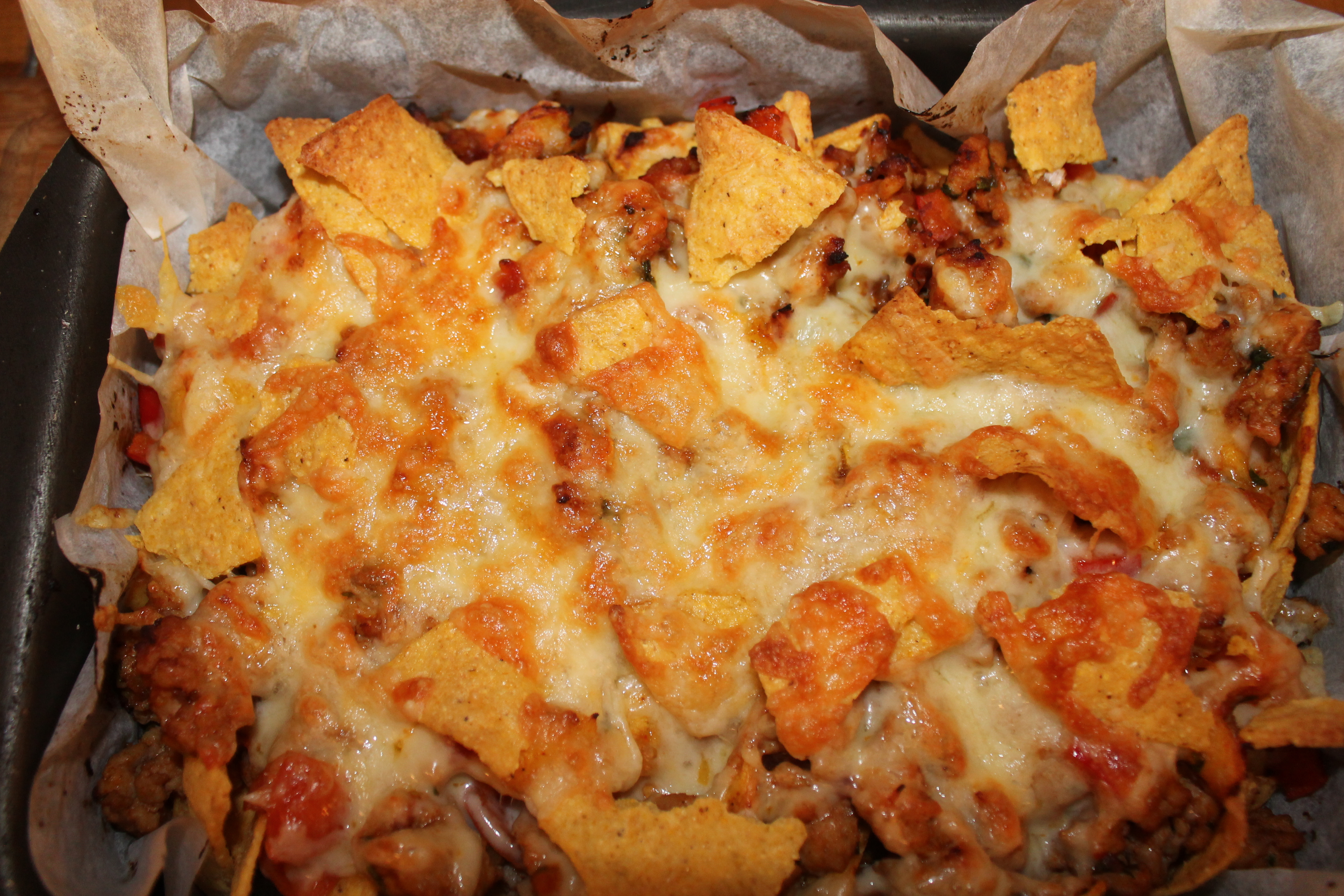 Så fortsetter du med et nytt lag nachos og kjøttdeig. Jeg avslutter med et tynt lag nachos.