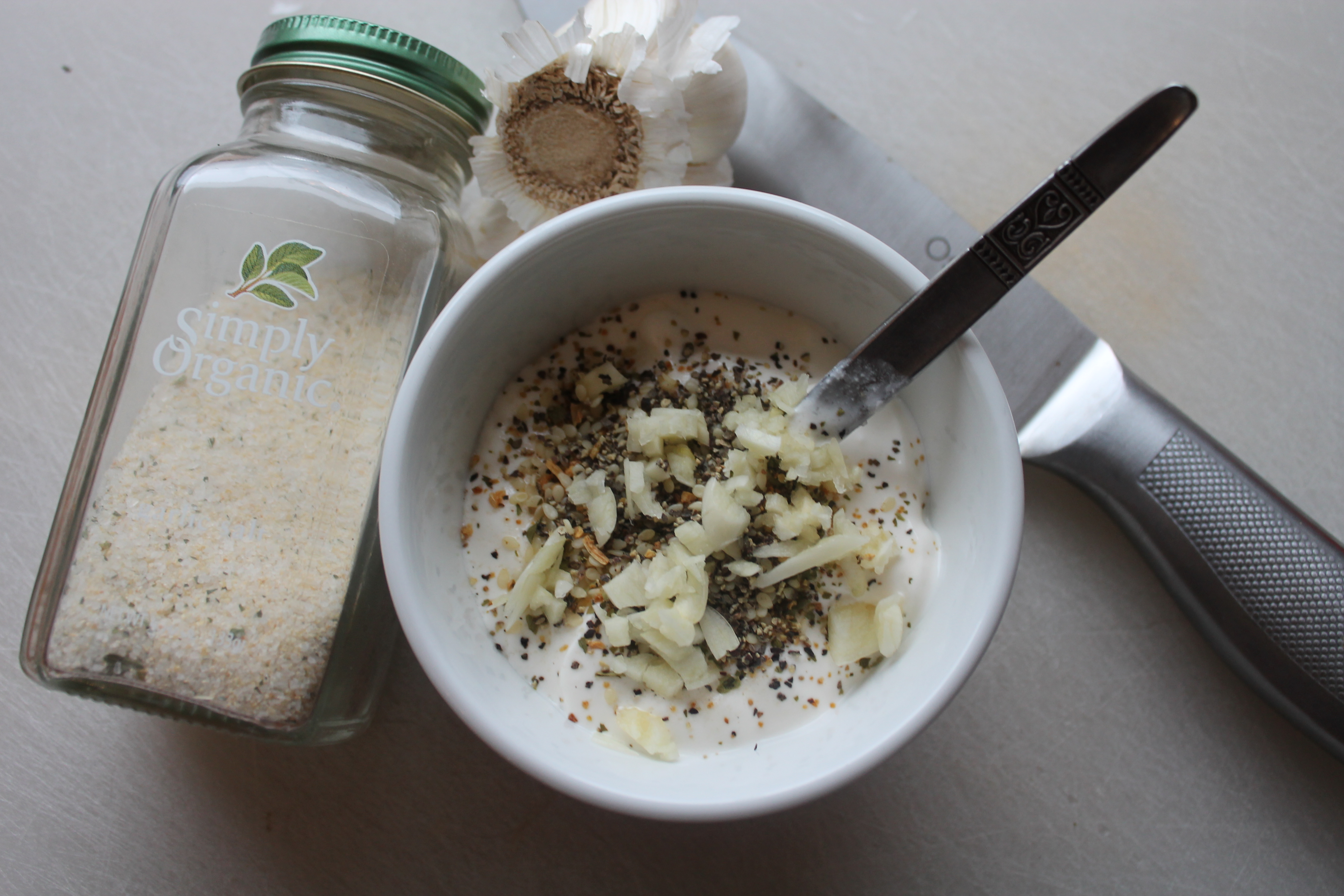 Jeg synes det passet bra med en frisk hvitløksdressing til disse kyllingburgerne og rørte derfor sammen 3 ss rømme, 1 finhakket hvitløksfedd og litt hvitløksalt og pepper.