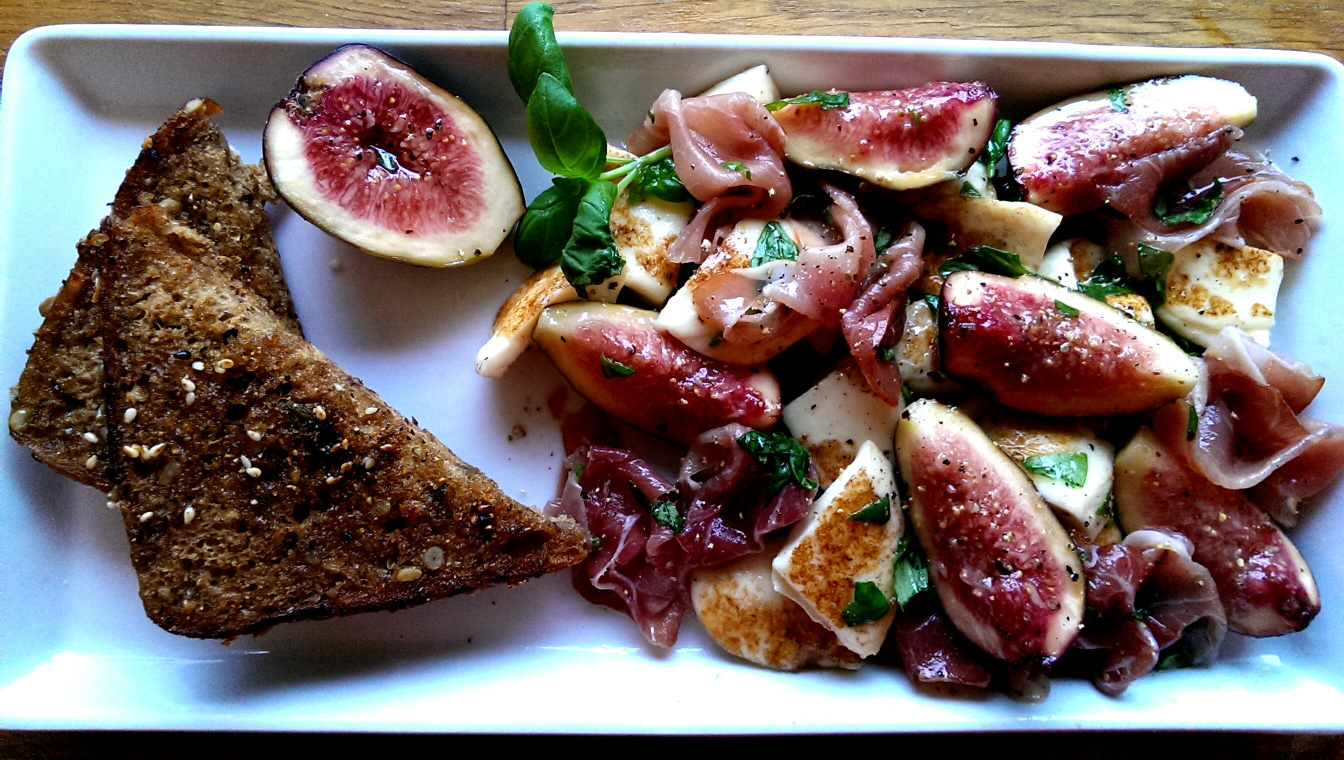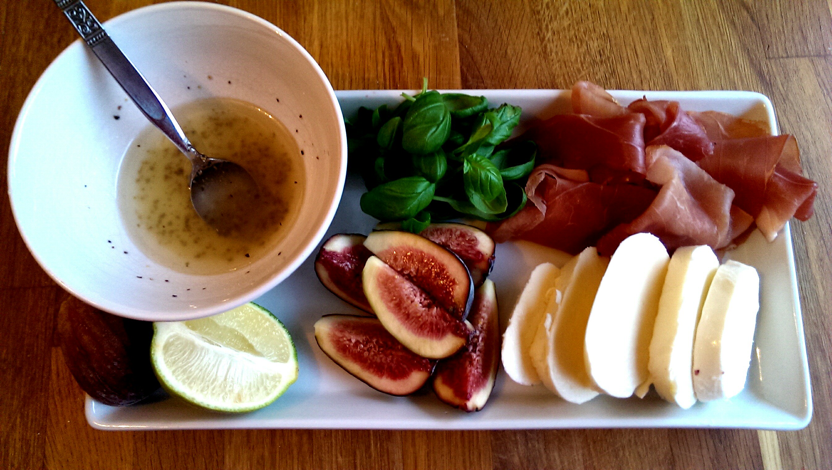 Dette er et godt komponert måltid med søt fiken, salt skinke, kremet ost og frisk dressing.