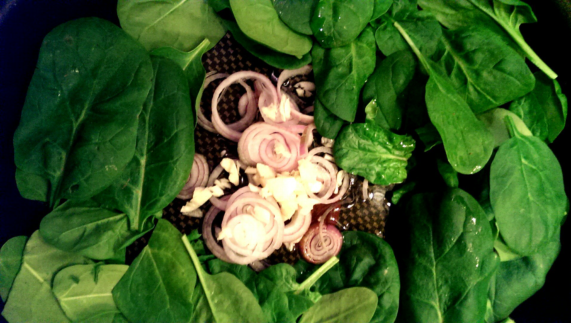 Mens pizzaen står i ovnen varmer du en finhakket hvitløk og sjalottløk i 1 spiseskje olje i stekepannen med spinaten. Målet er å trekke ut den syrlige smaken i spinaten.
