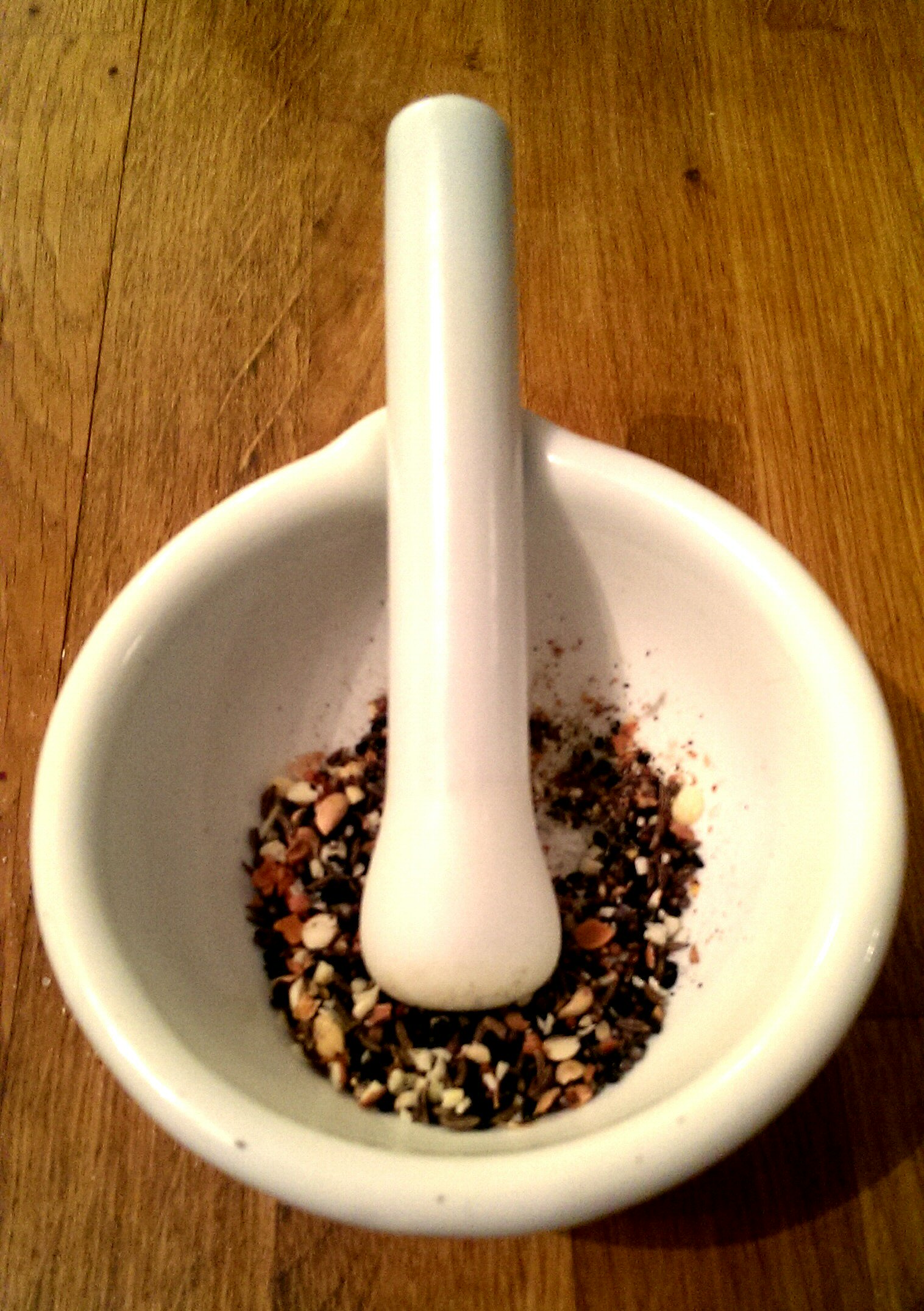 Ønsker du enda mer smak tilsetter du sennepsfrø, karve, bukkhornsfrø og svart kumminfrø som er knuses i morter før du tar de i pannen med solsikke- og gresskarkjernene.