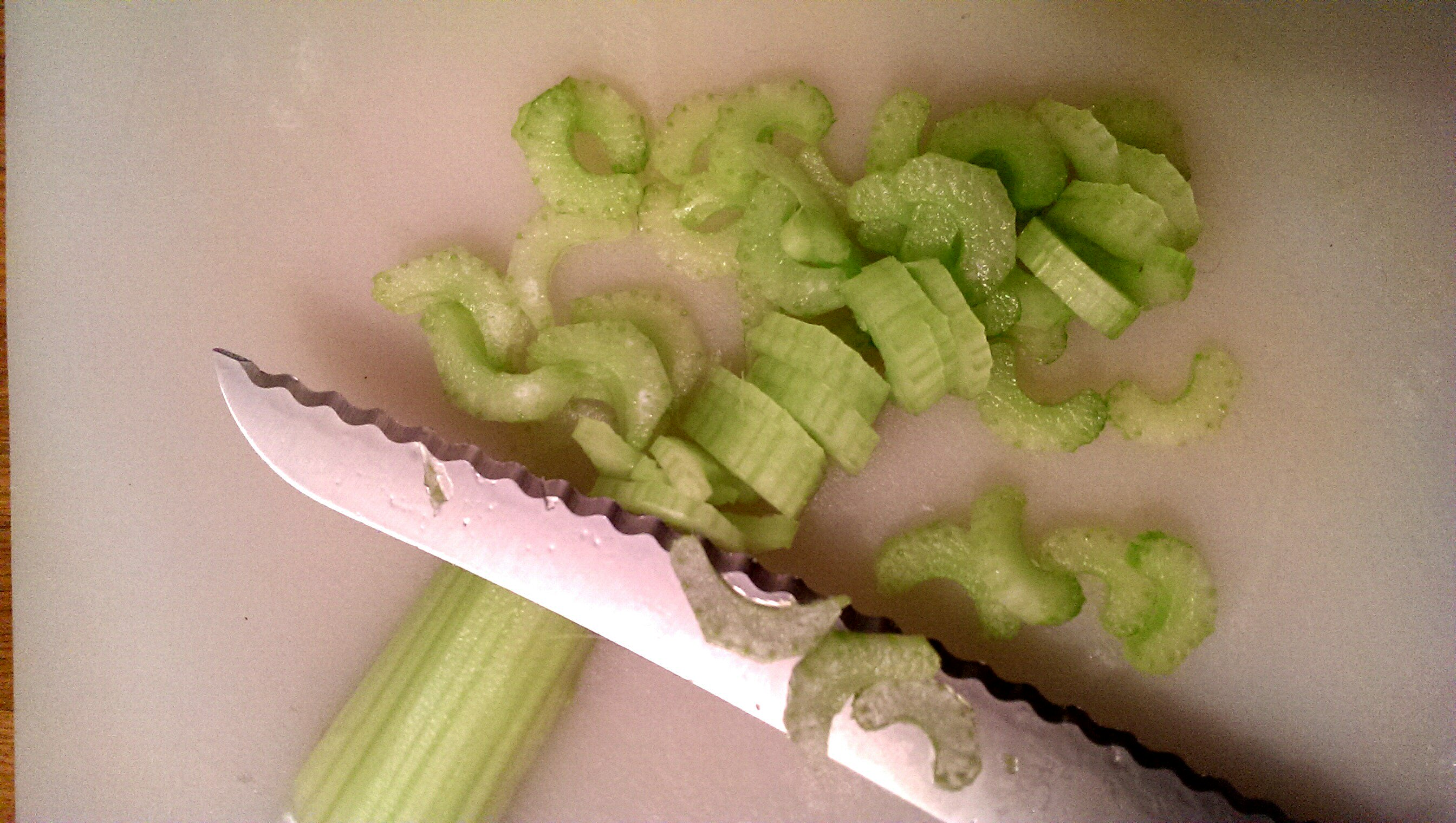 Kokk opp en kjele med vann og litt salt. Skrell stangsellerien og skjær den i tynne skiver.