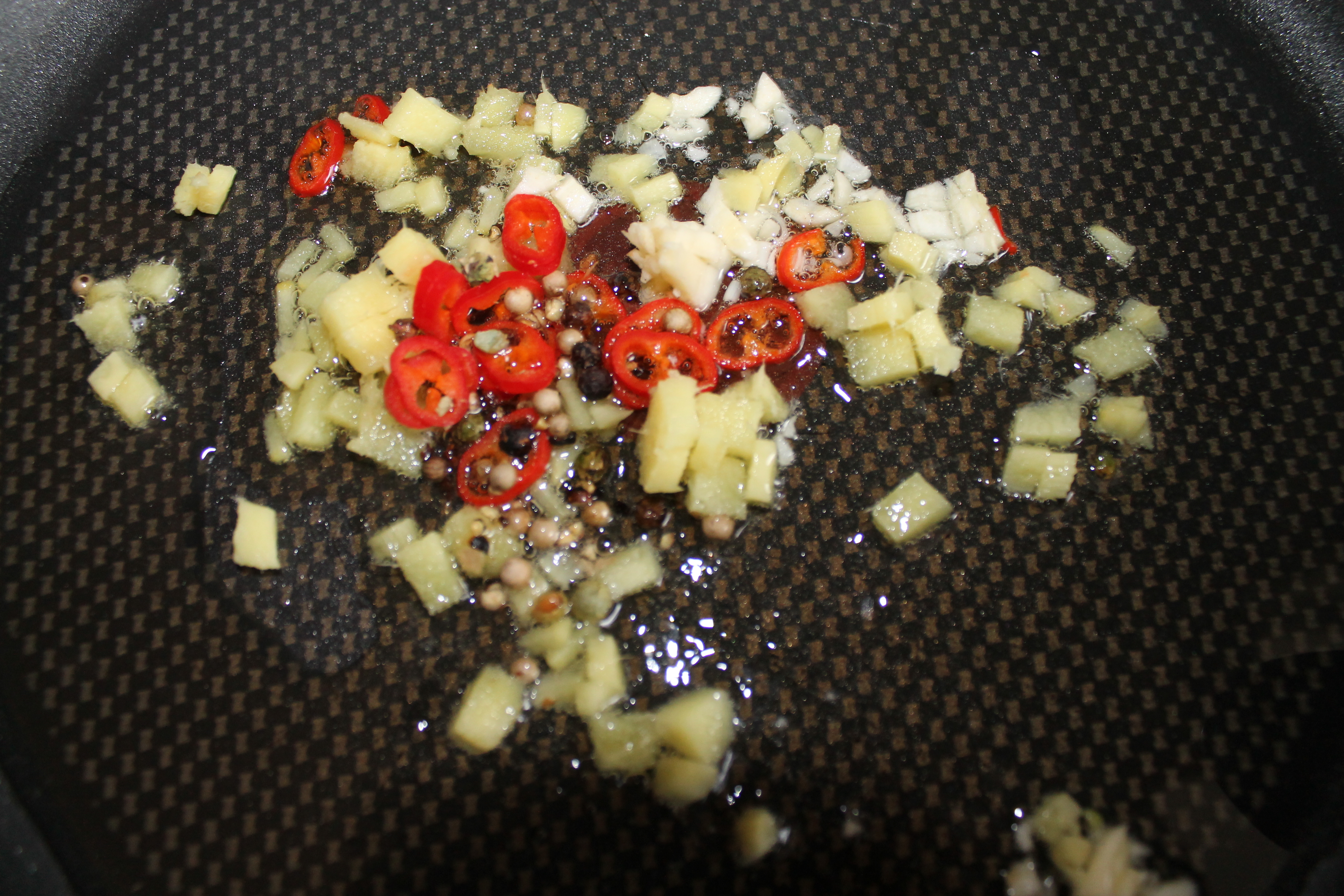 Start med å frese den finhakkede hvitløken, chilien og ingefæren sammen med litt kokosolje/rapsolje og den hele pepperen. Du skjønner allerede nå at dette kommer til å smake like bra som det lukter 😉
