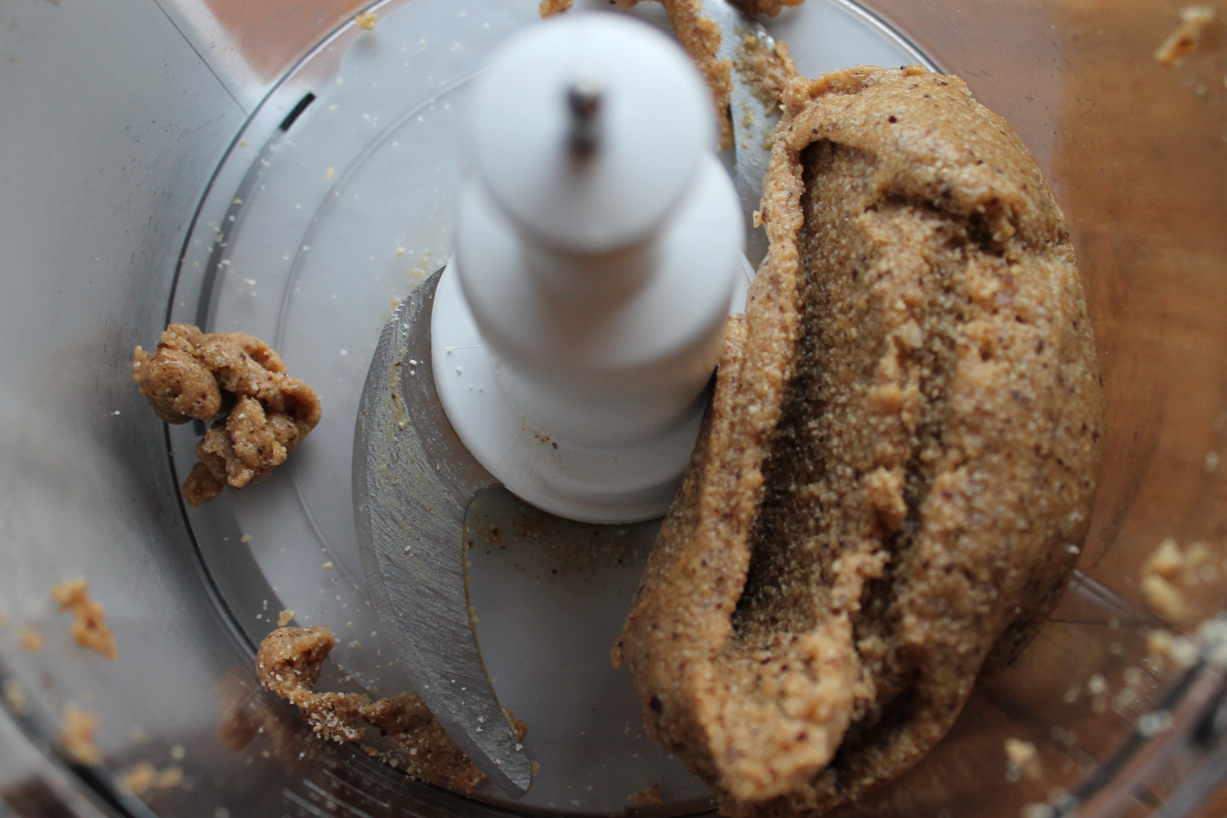 Først kjører du cashewnøtter og havremel i foodprosessoren i ca 30 sekunder.
