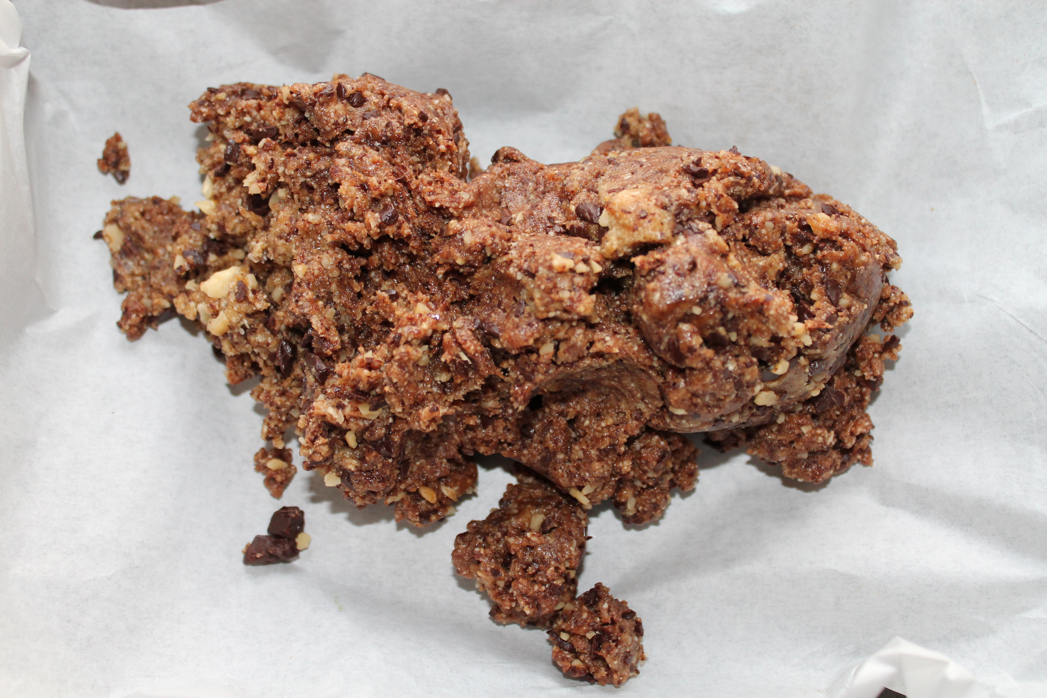 Og det er her jeg bommet!! Jeg kjørte den for lenge slik at all sjokoladen ble finfordelt i hele deigen. Misforstå meg rett. Det gjør ingen ting og det smakte himmelsk, men mine barer ser litt annerledes ut enn originalen og jeg kunne heller tenke meg å ha færre og større biter av nøtter og sjokolade. Jo lenger du kjører den jo mindre sjokoladebiter får du eller jo mer sjokolade får du i hele deigen. Neste gang skal jeg ikke kjøre den så lenge 😉