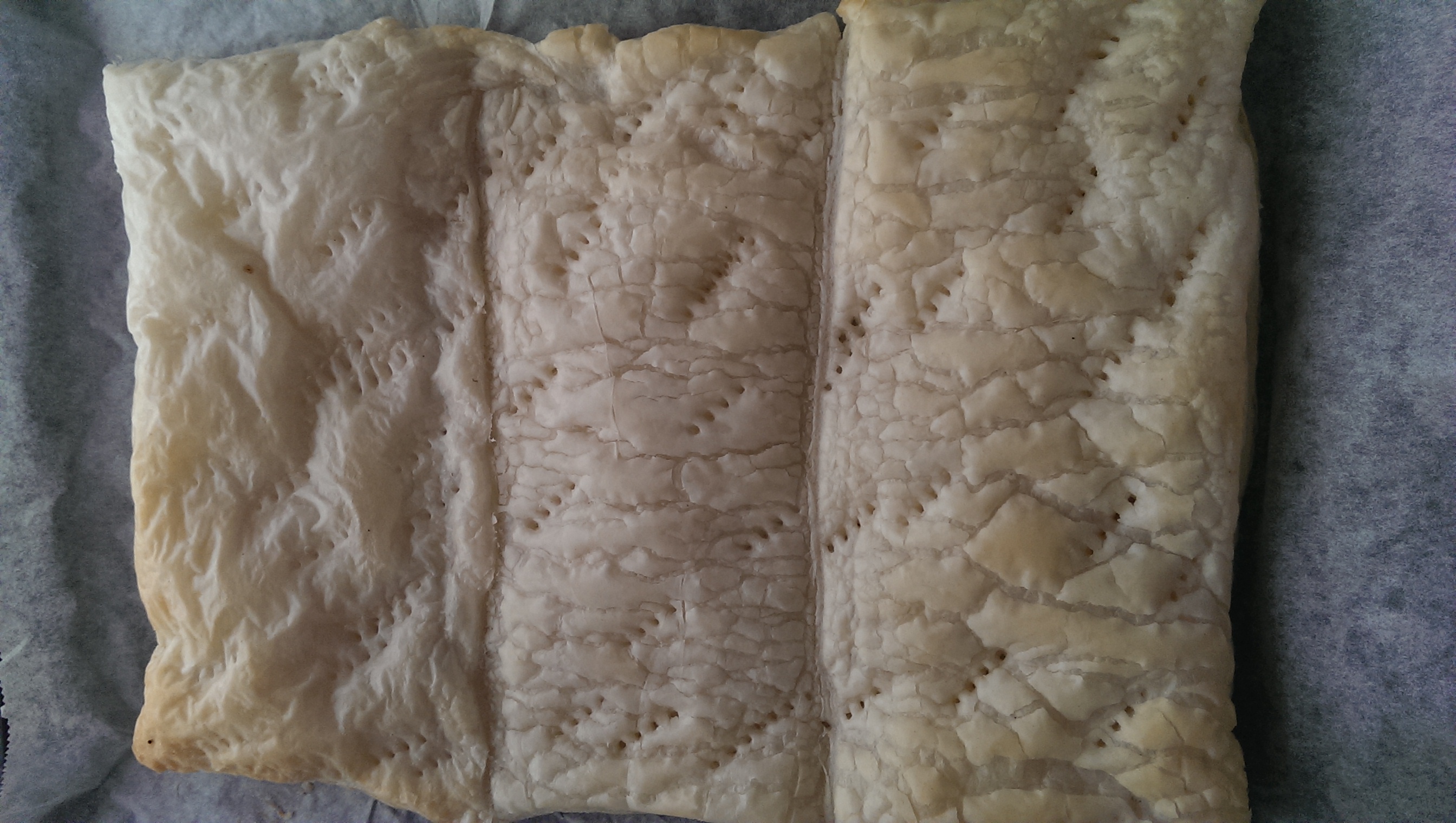 Tin butterdeigplatene og kjevle de ut på et bakepapir. Stikk hull på deien og forstek den i ovnen i 10 minutter på 200 grader.