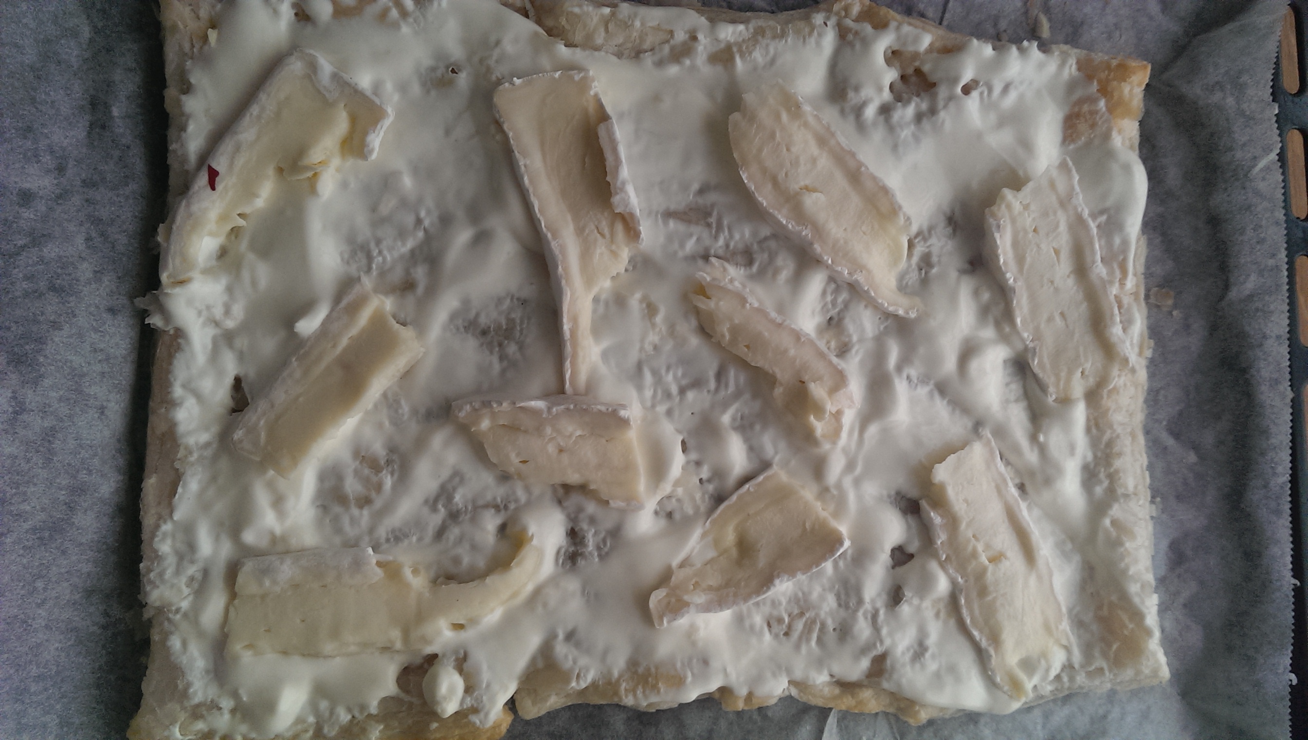 Smør på et lag creme fraiche og fordel osten i tynne skiver.