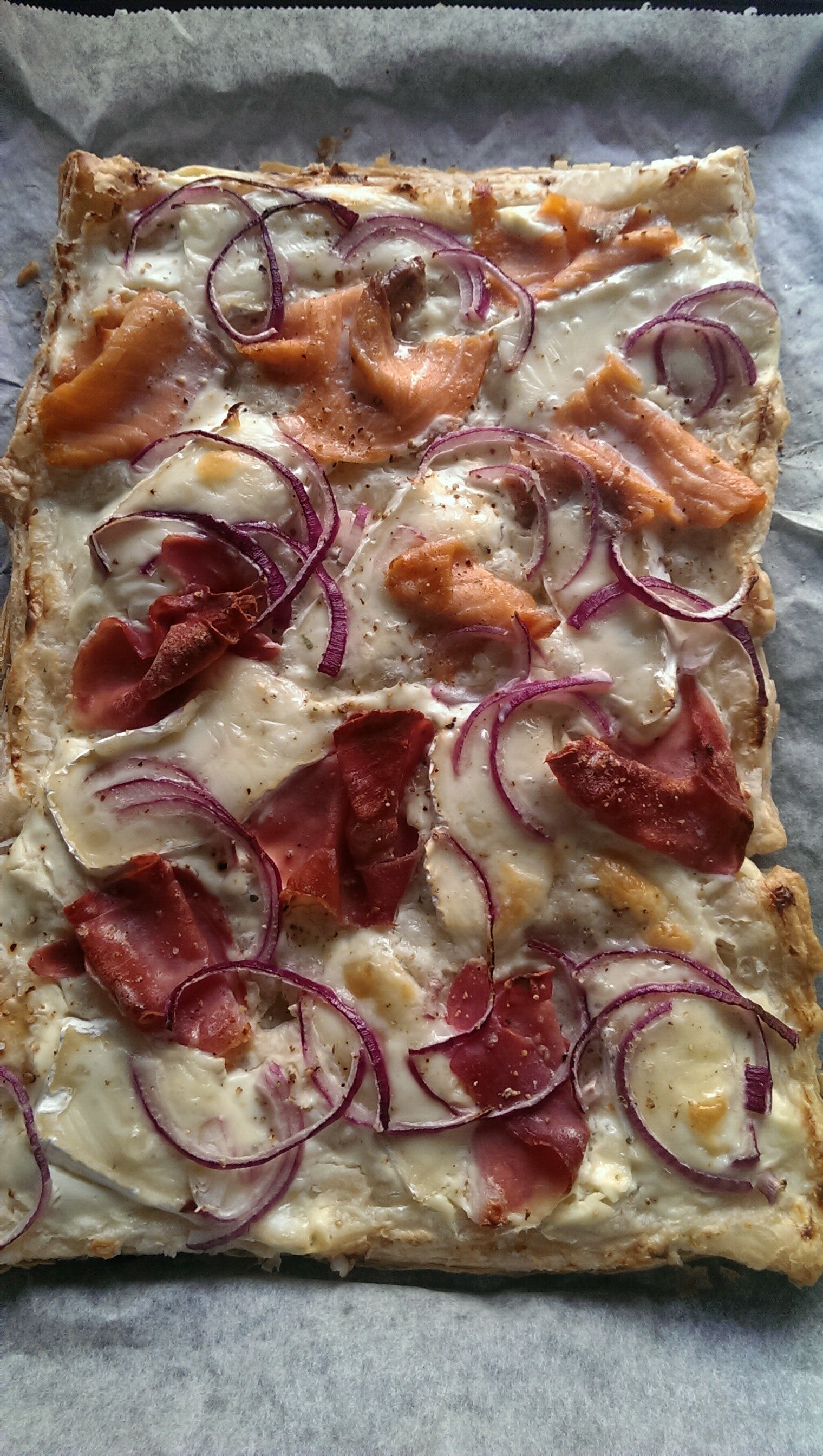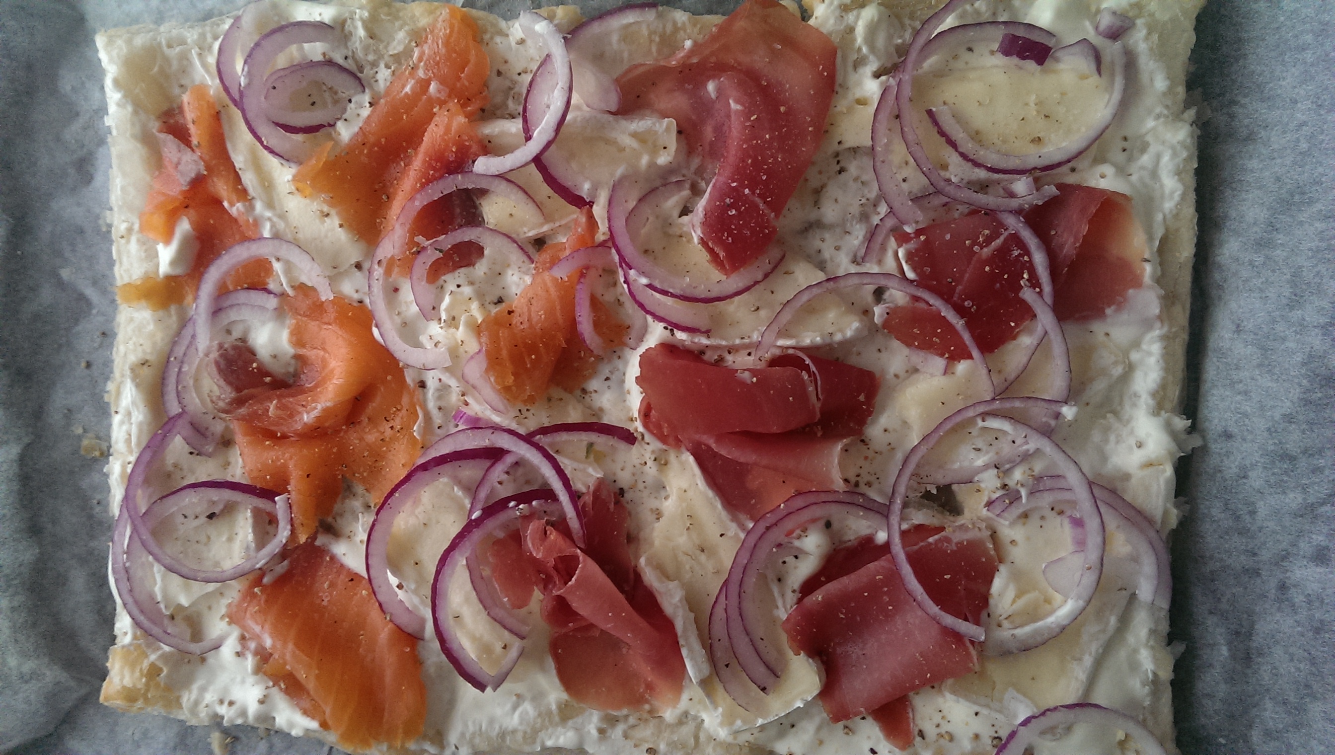 Legg på noen lakseskiver på halve deigen og skinke på den andre halve. Legg toppingen slik at skinke eller fisken ikke ligger oppå osten. Da kommer alle smakene bedre frem.