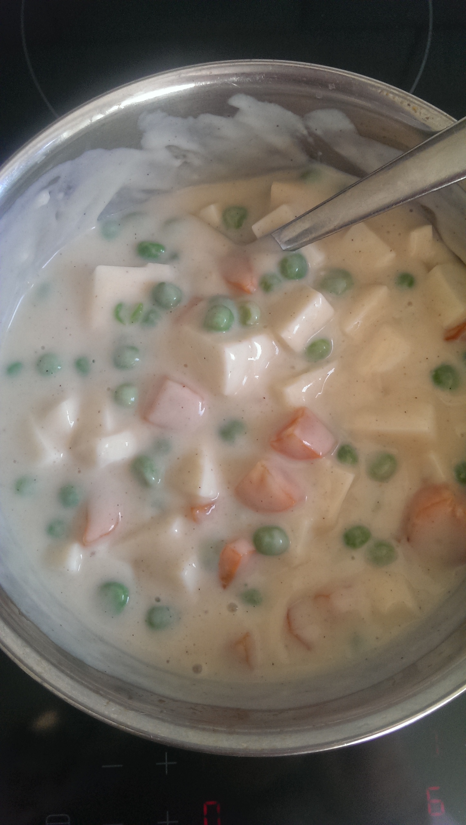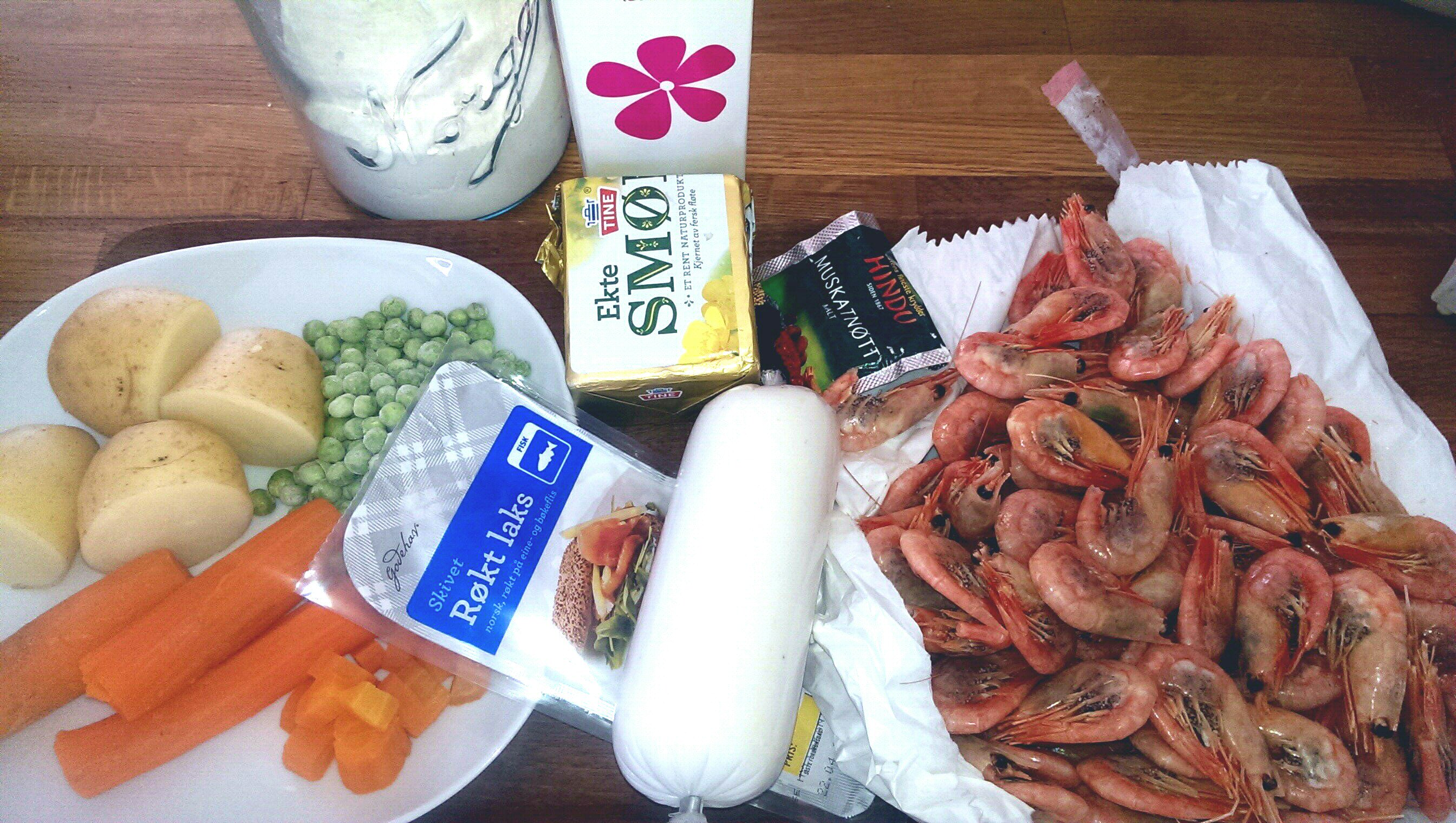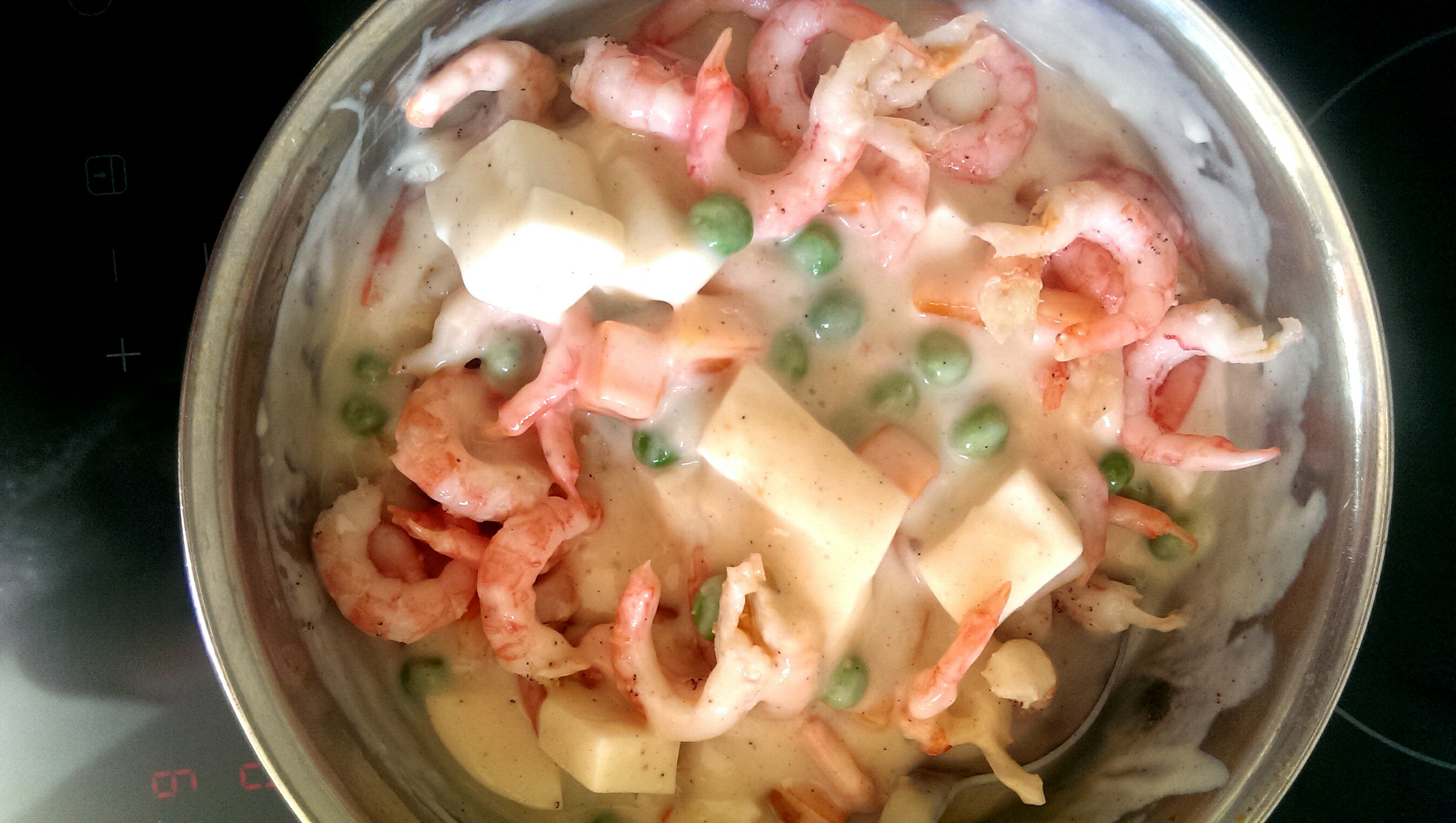 Den tar ikke lenger tid å lage enn potetene må koke. Visp sammen hvit saus og tilsett en boks med gulrot og erter. Skjær opp fiskepudding og skrell reker (eller et glass pillede) og tilsett en god teskje muskat eller karri etter smak.
