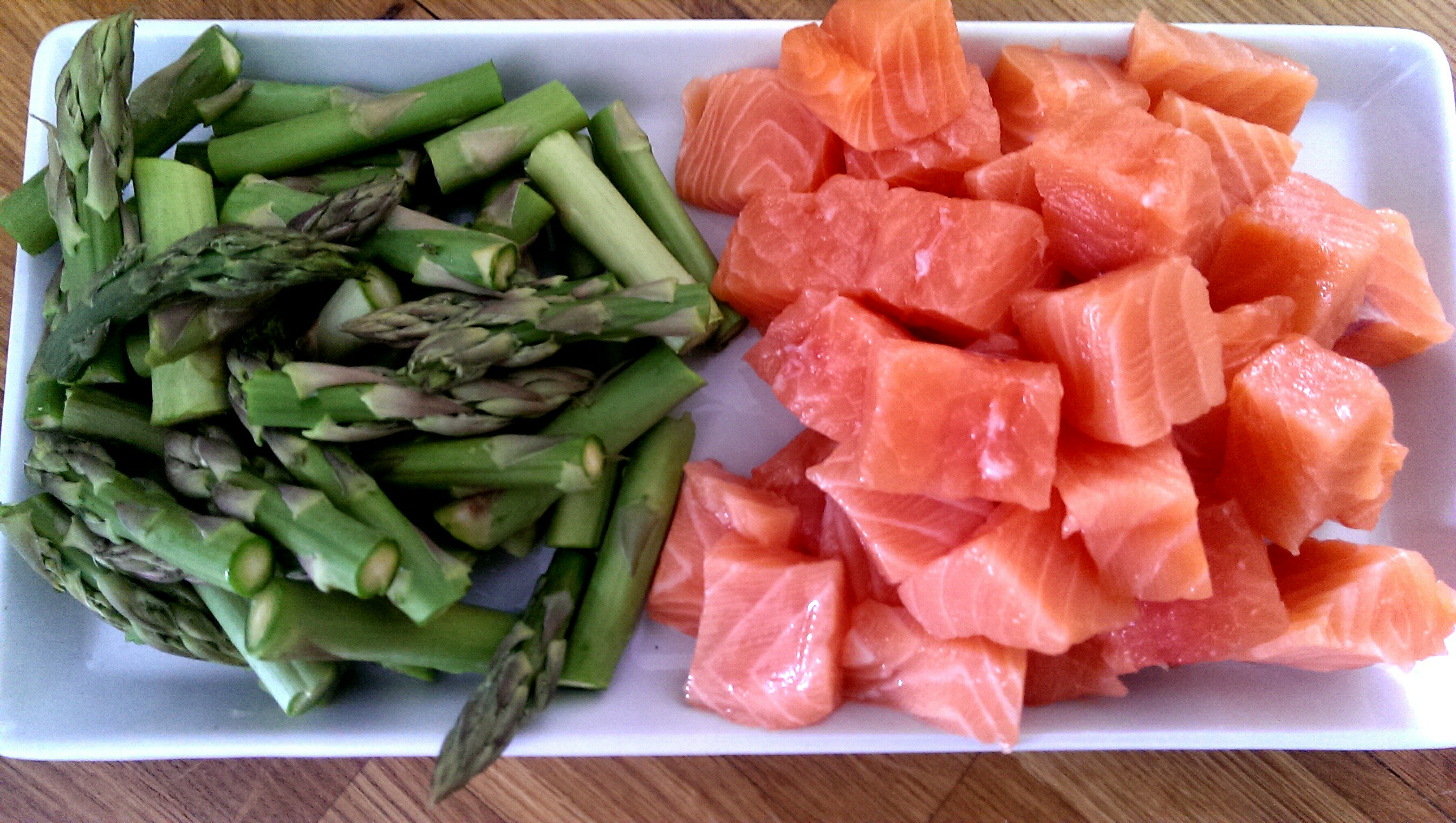Du kan selvfølgelig velge å følge oppskriften til punkt å prikke, men jeg var litt redd for at laksen skulle bli «tørr» ved å forsteke den så jeg fulgte oppskriften helt frem til jeg kom til aspargesen og laksen. Når suppekraften hadde fått småkokt i 10 minutter tok jeg opp i aspargesen og lot den småkoke i ca 8 minutter.