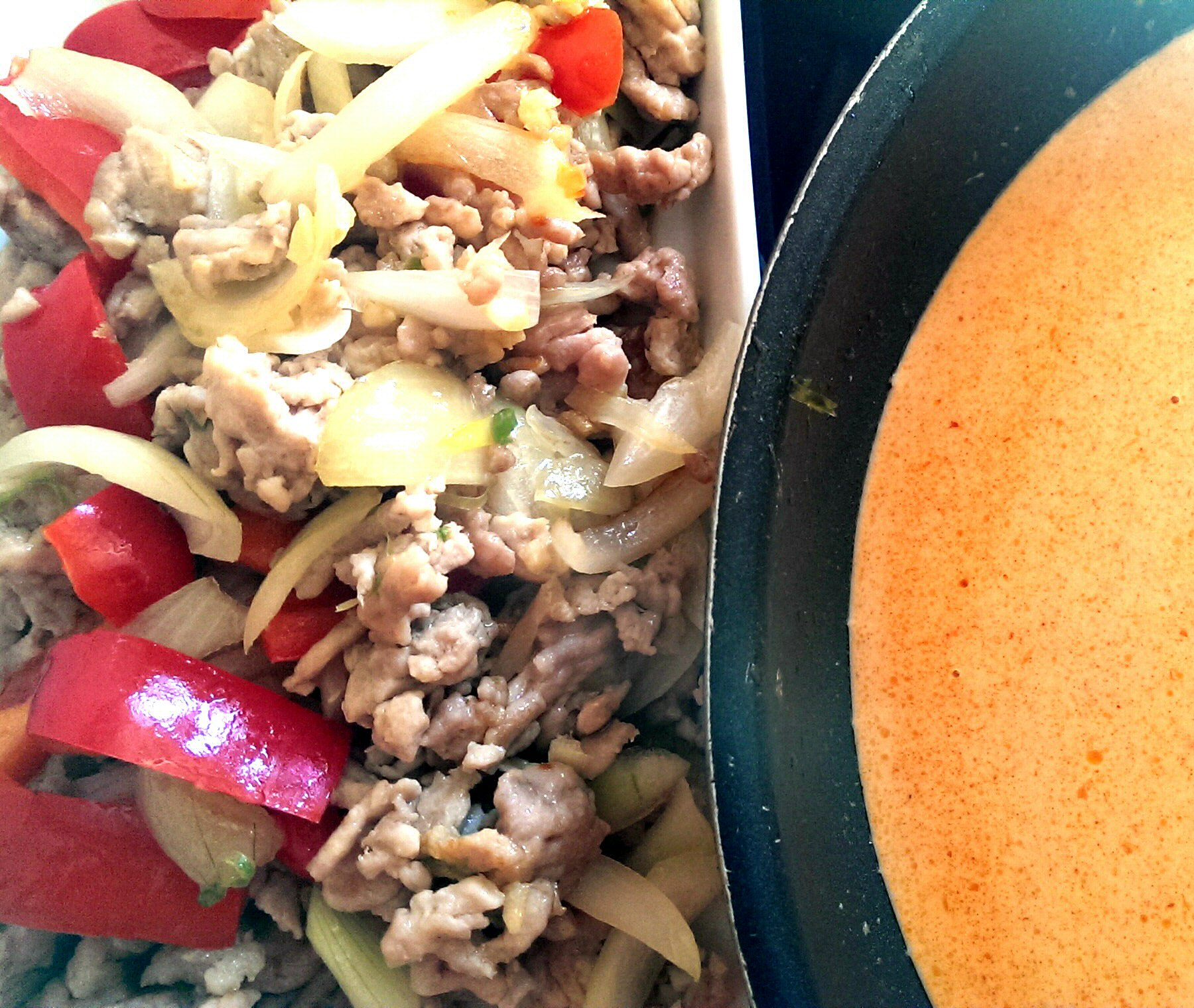 Jeg brukte 400 gram kyllingkjøttdeig, 1 rød paprika og 1 løk i strimler, 2 finhakkede hvitløksfedd, 1/3 finskåret grønn chili, 1 boks kokosmelk og litt frisk persille.