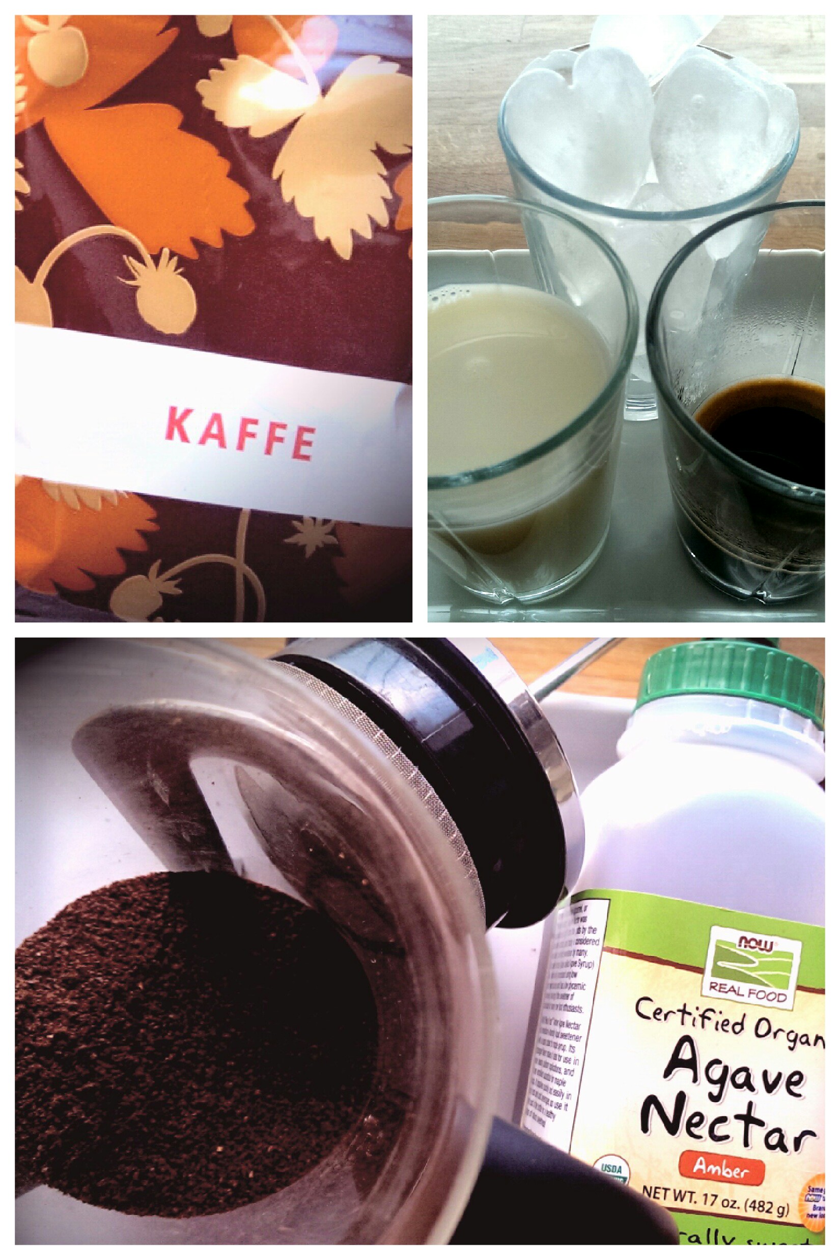 Jeg lagde ekstra sterk kaffe i presskannen. Brukte ca 3 toppa skjeer på 1 dl kokt vann. Lag/trakt kaffen og la den kjøle seg ned litt før du kjører den i blenderen sammen med melk, agave sirup og isbiter.