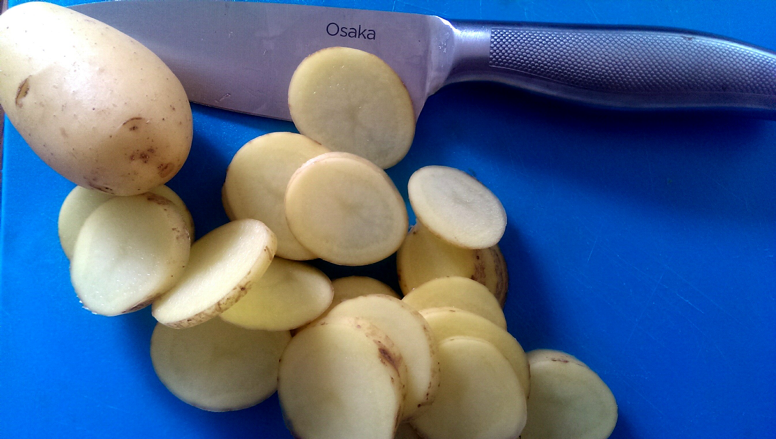 Skjær potetene i tynne skiver og skyll av stivelsen i et dørslag.
