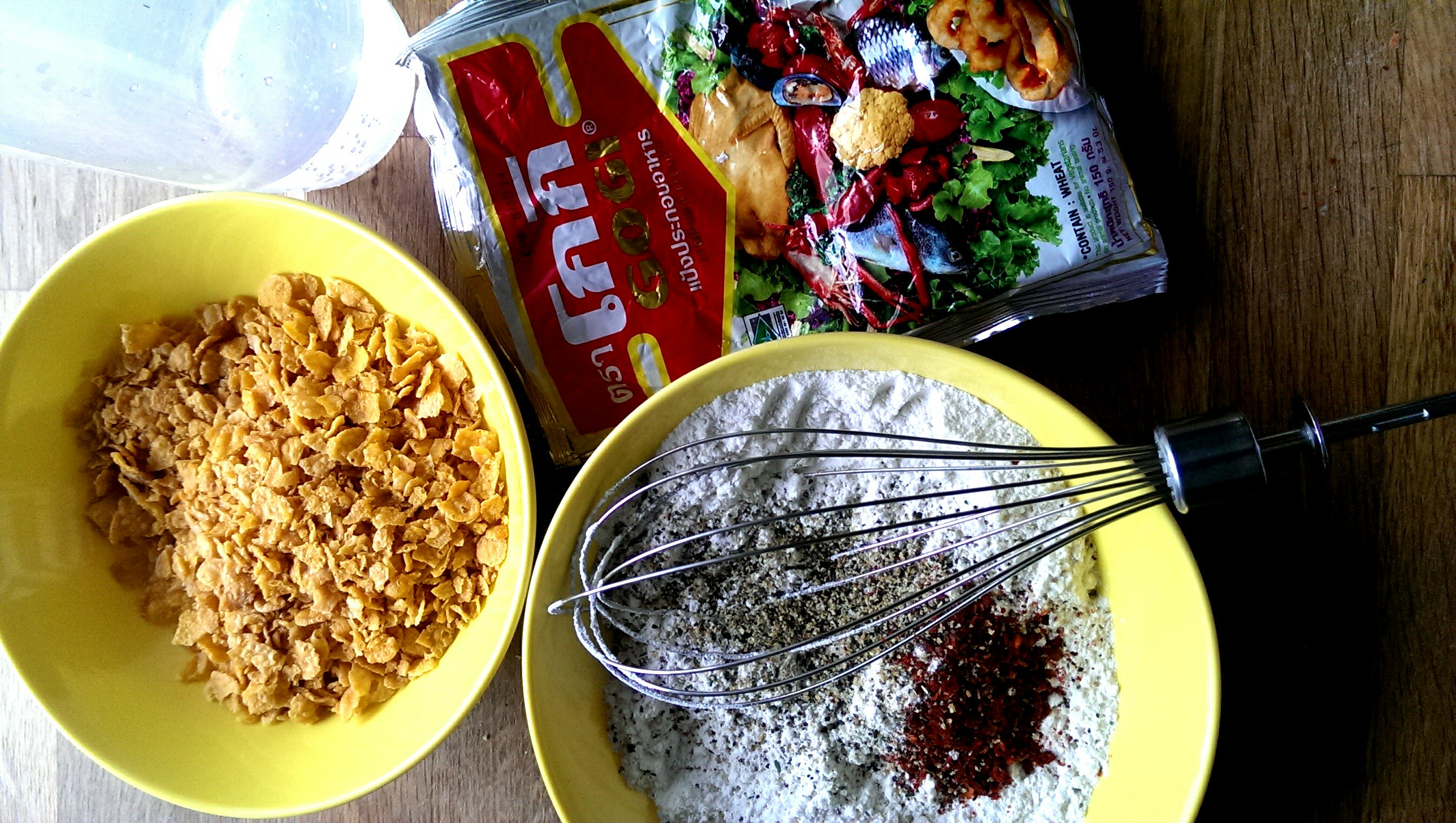Rør sammen tempurapulveret og krydderet før du tilsetter kaldt vann og blander godt.