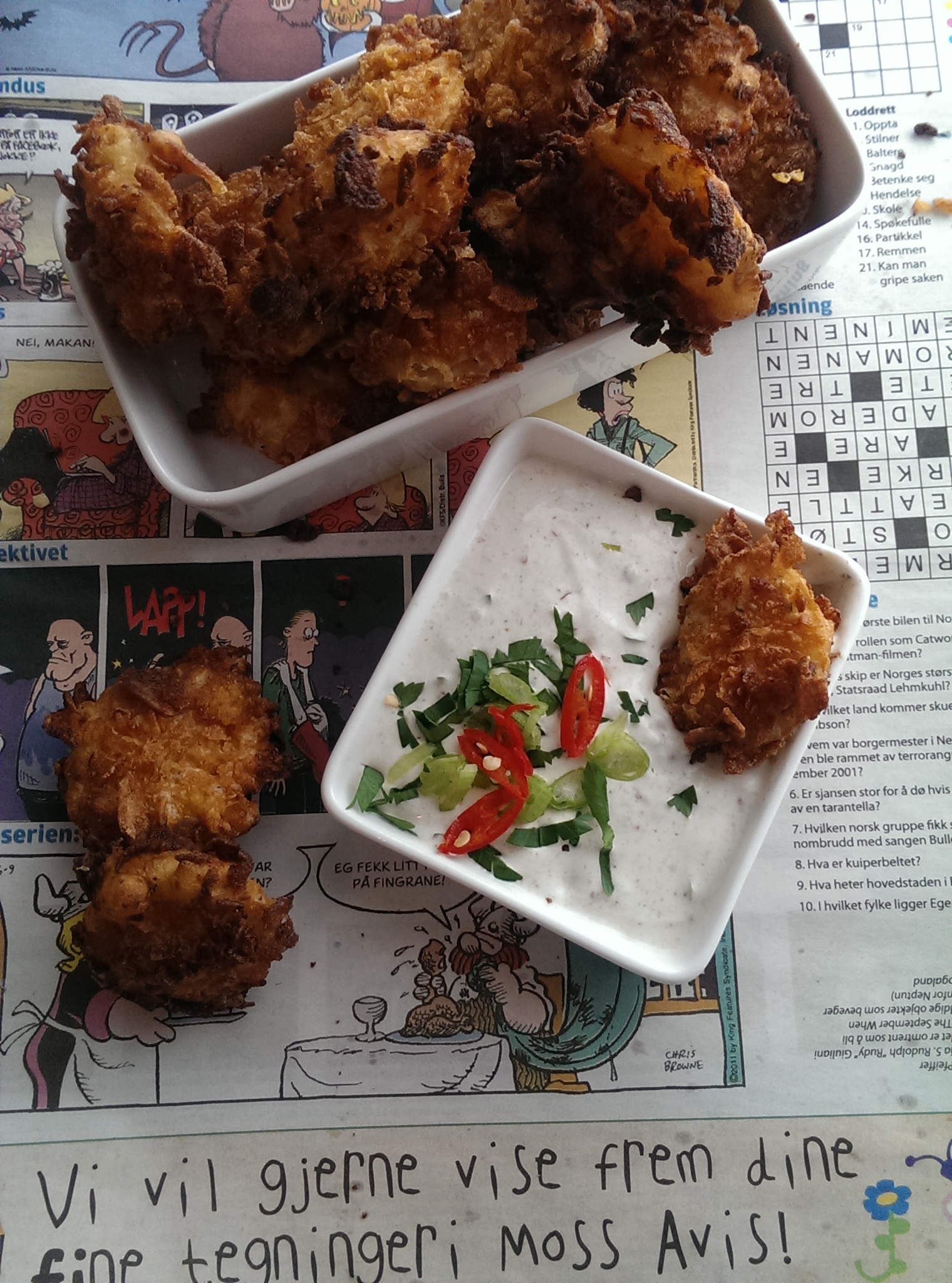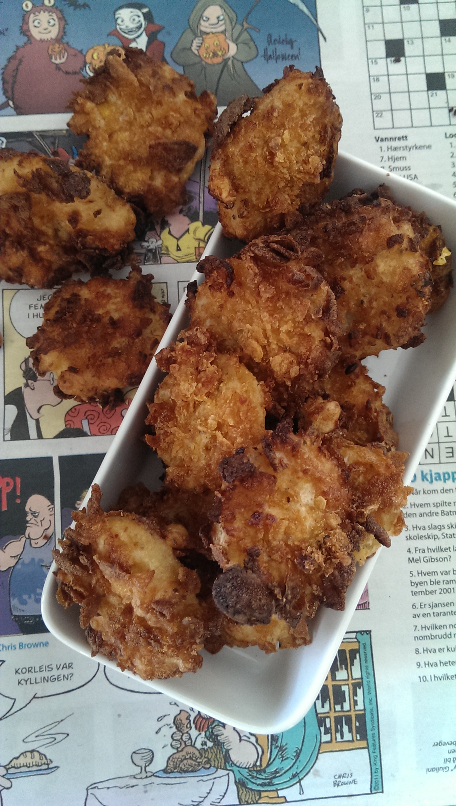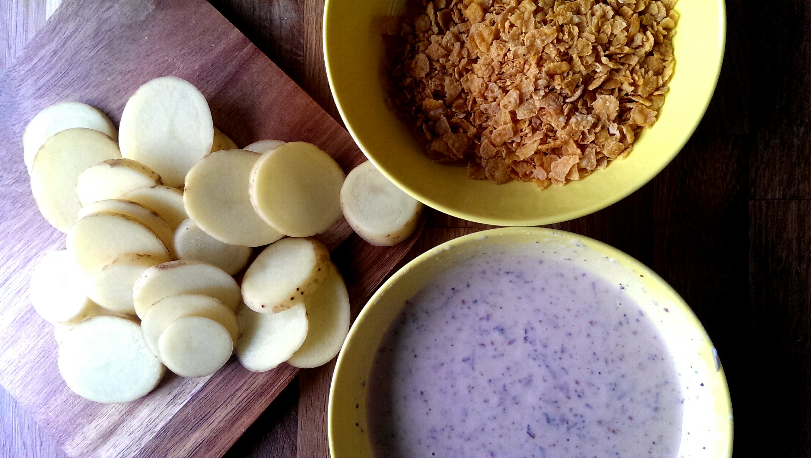 Dette er potetens svar på løkringer! Frityrstekte potetskiver rullet i tempuramiks, paprika, hvitløkspepper og estragon før de vendes i sprø cornflakes 🙂