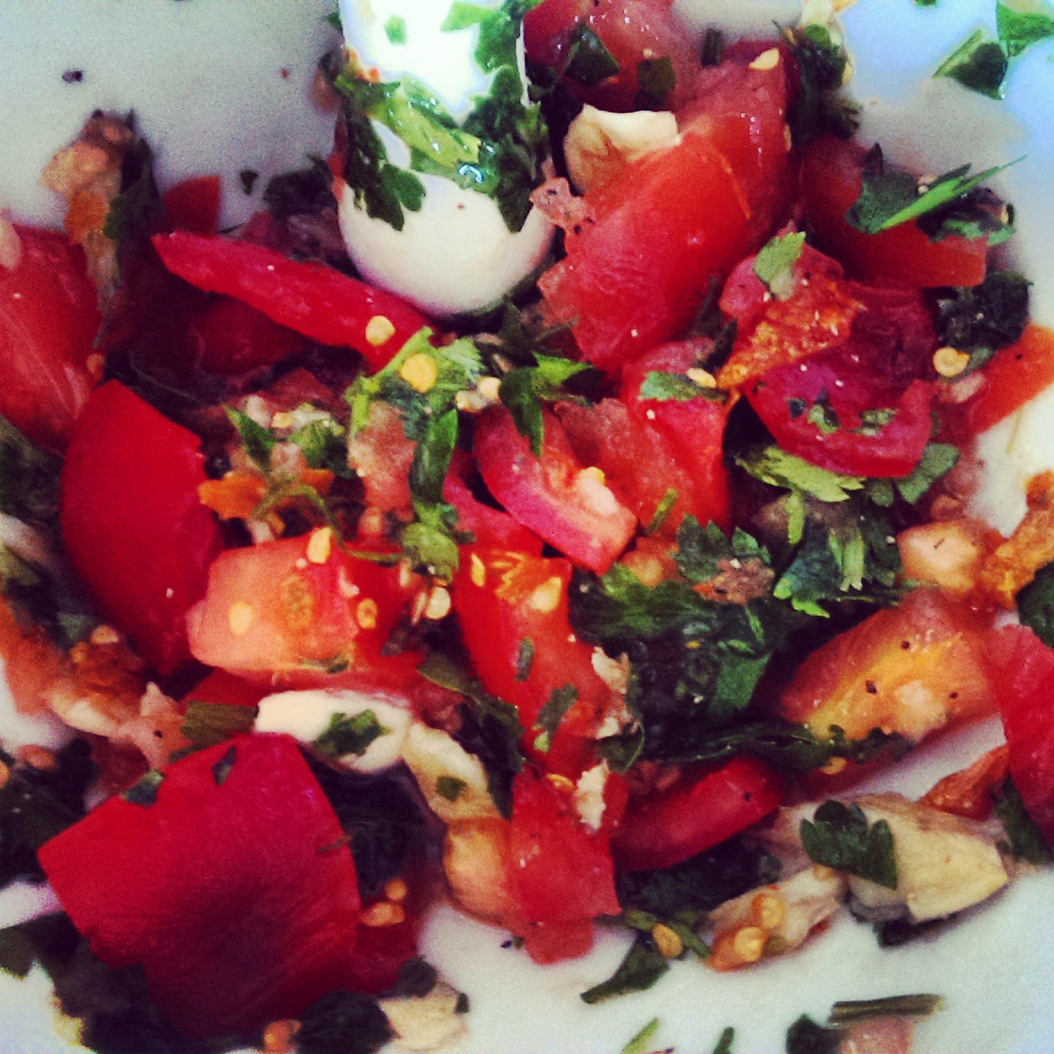 1 neve smakfulle plommetomater eller 1 stor bifftomat