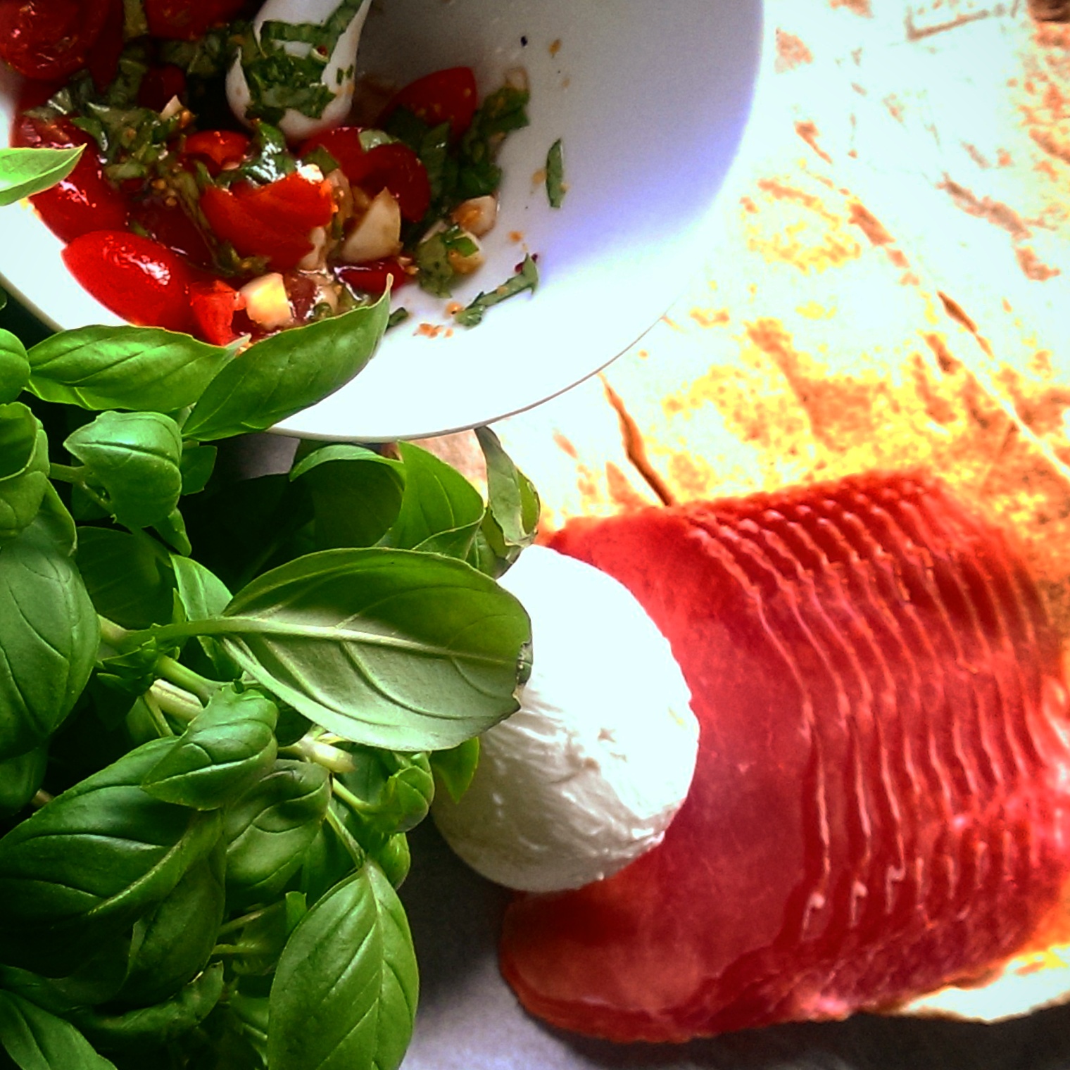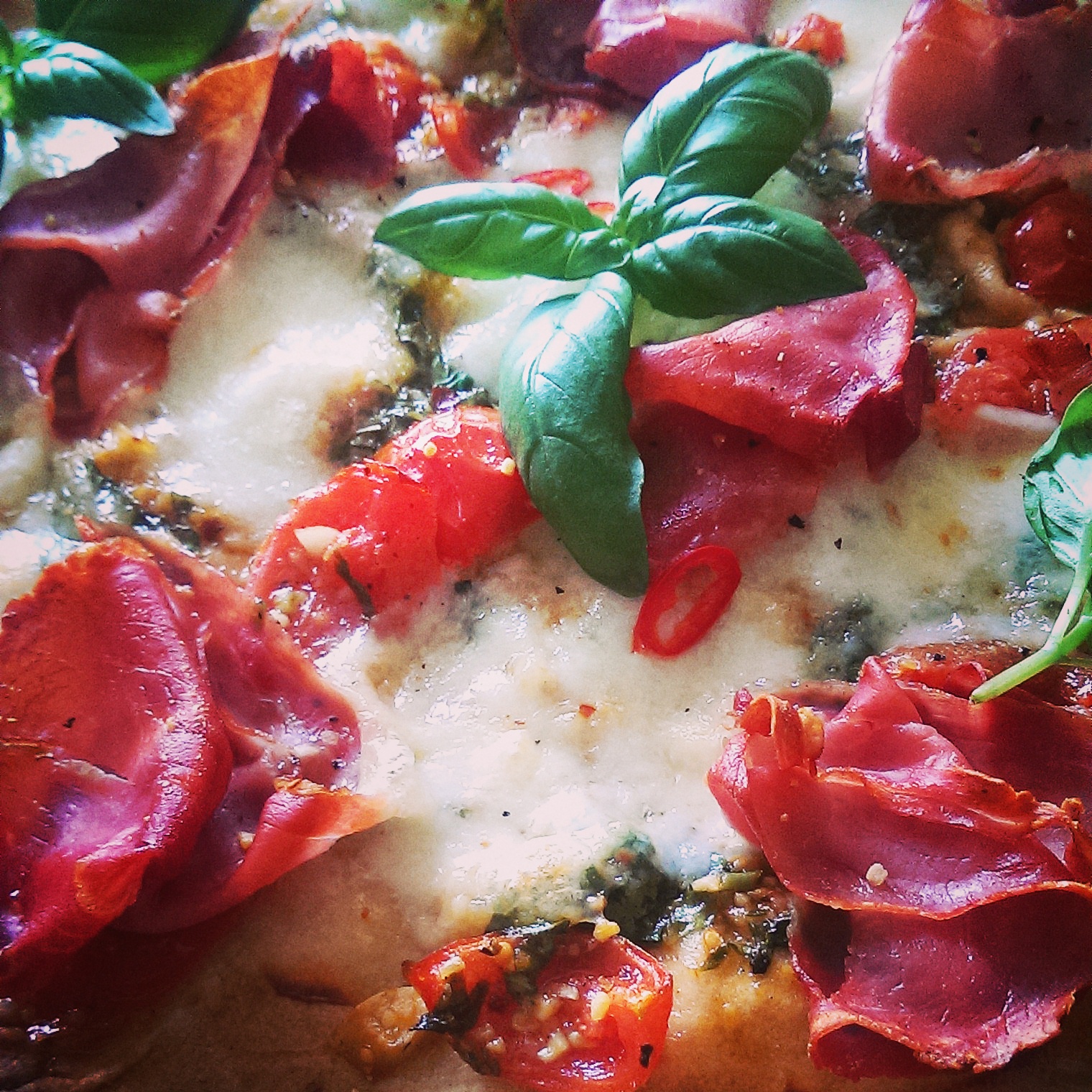 Tomat + basilikum = sant!! Og hvis du i tillegg slenger på salt serranoskinke og smakfull mozzarella får du en fantastisk digg hjemmemekka pizza på 20 minutter.