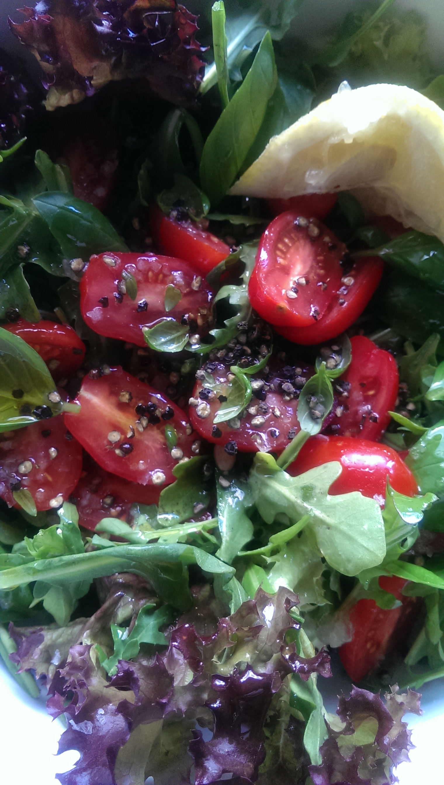 Del tomatene i to og riv salaten i store biter. Legg alt i en stor bolle.