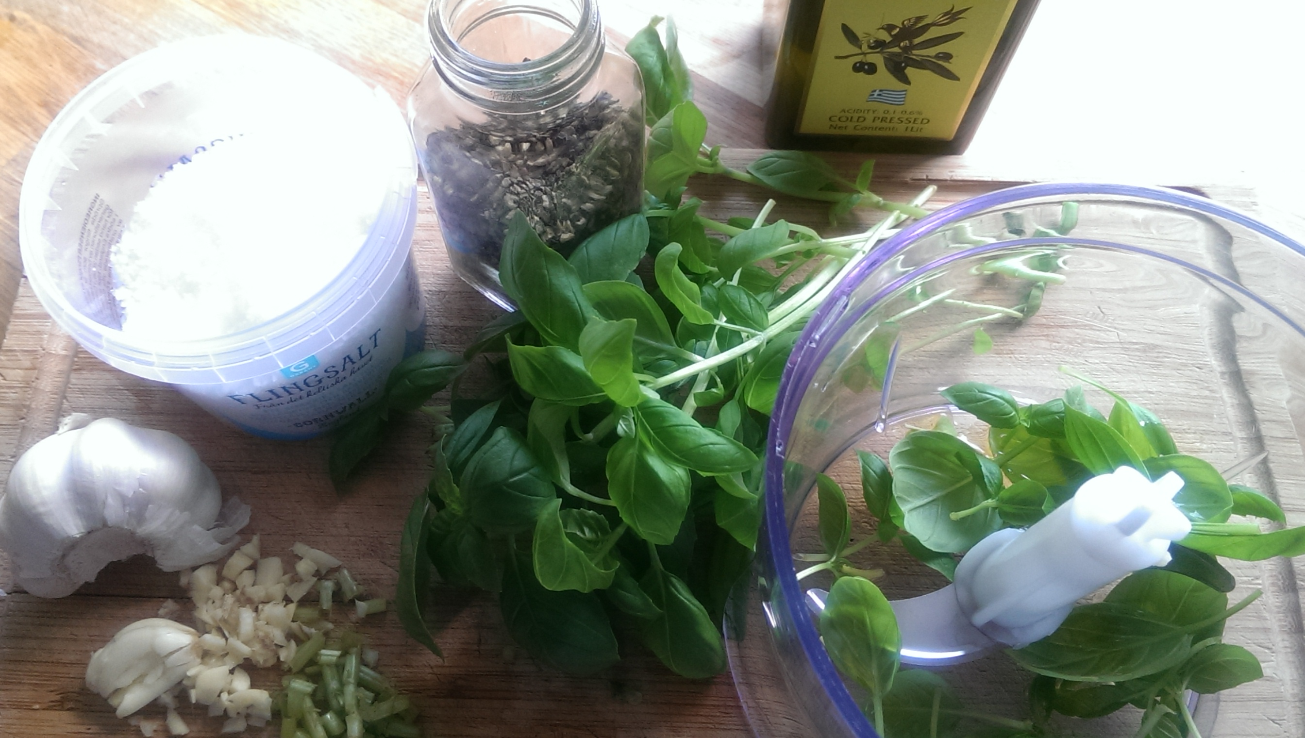 2 finhakkede hvitløksfedd, 1/2 potte basilikum, 1,5 dl olivenolje, en klype fingersalt og litt grovkvernet pepper kjøres raskt i en mixer. Bruk gjerne stilkene til basilikumen også da de gir god smak. Vips har du en deilig og smakfull dressing på 2 minutter.