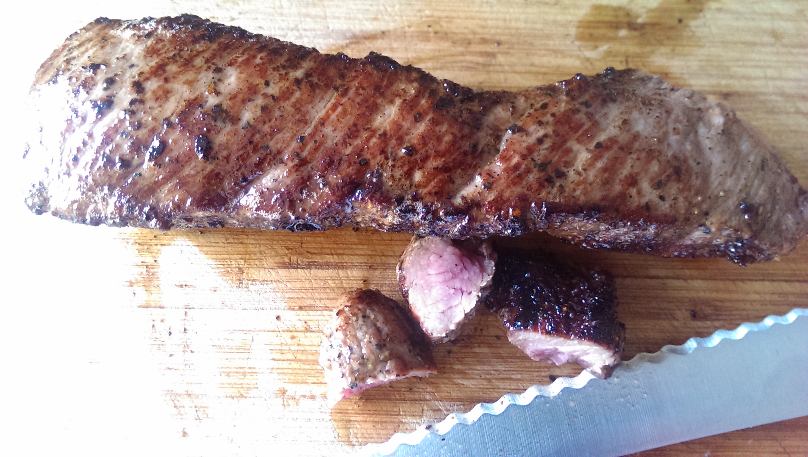 Biffkjøttet brunes raskt på alle kanter og får hvile noen minutter før oppskjæring. Jeg liker ikke å gjennomsteke biffen og tar den helst medium, men det er opp til den enkelte.