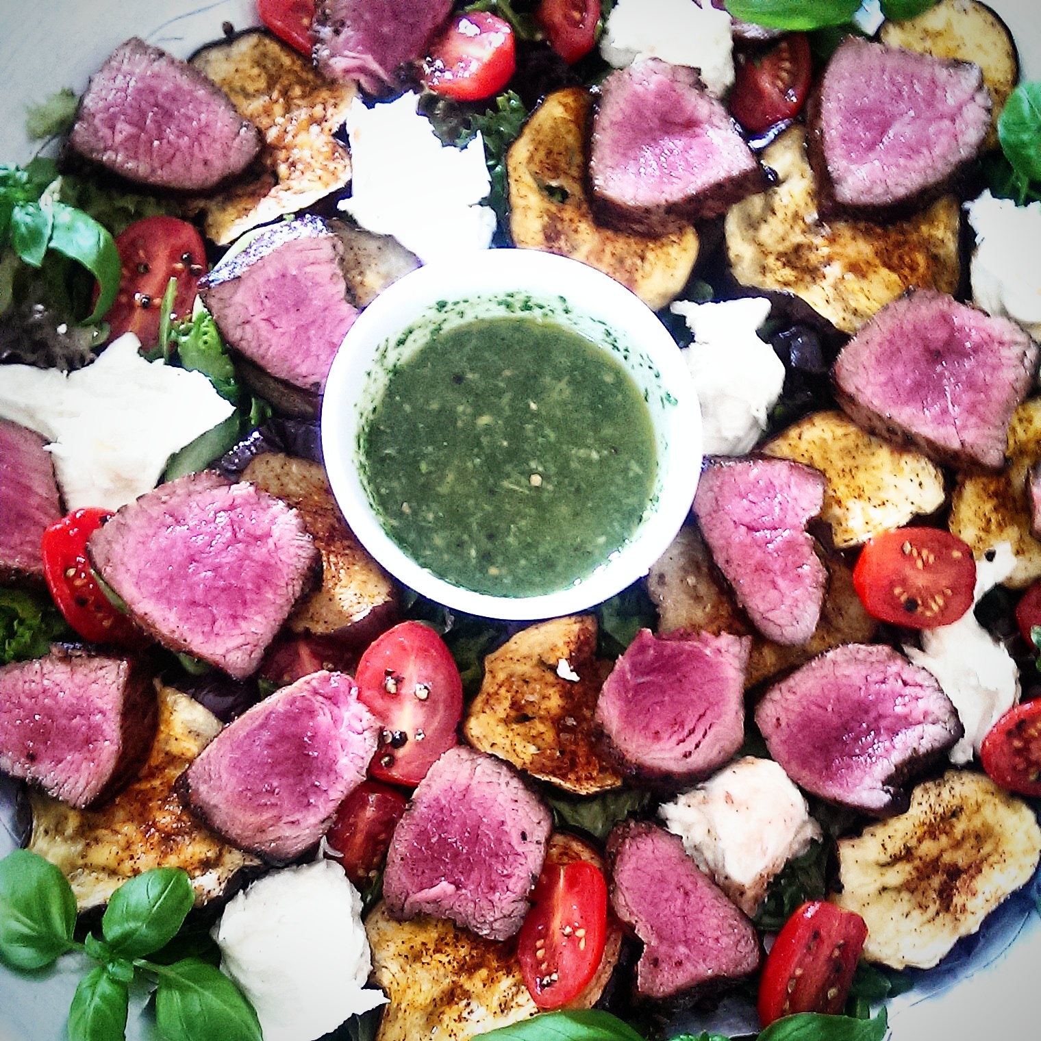 Supersunn biffsalat med få ingredienser og mye smak. Biff i tynne skiver, mozzarella og grillet aubergin legges på en seng av blandet salat og noen smakfulle plommetomater. Som dressing brukte jeg en enkel basilikumpurè . Liker du ikke aubergine kan du bare droppe den eller bytte ut med asparges.