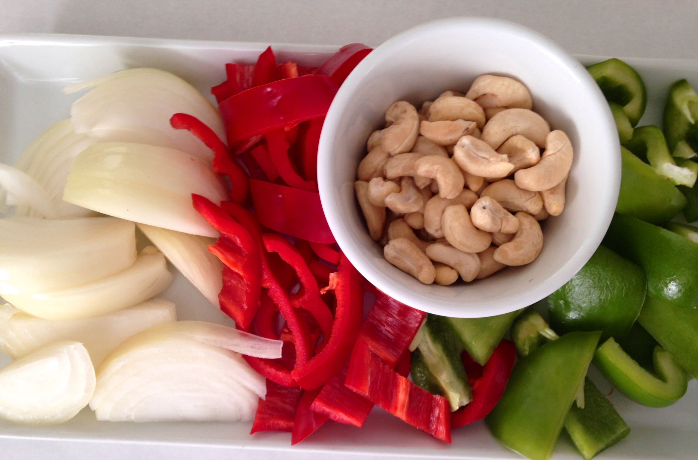 Serveres med brasserte grønnsaker, ristede cashew nøtter og ris.