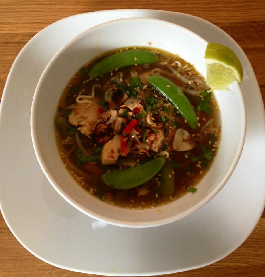 Suppen er også genial å servere som forrett til sushi, vårruller eller annen asiatisk mat og bytt gjerne ut kyllingen med scampi 🙂
