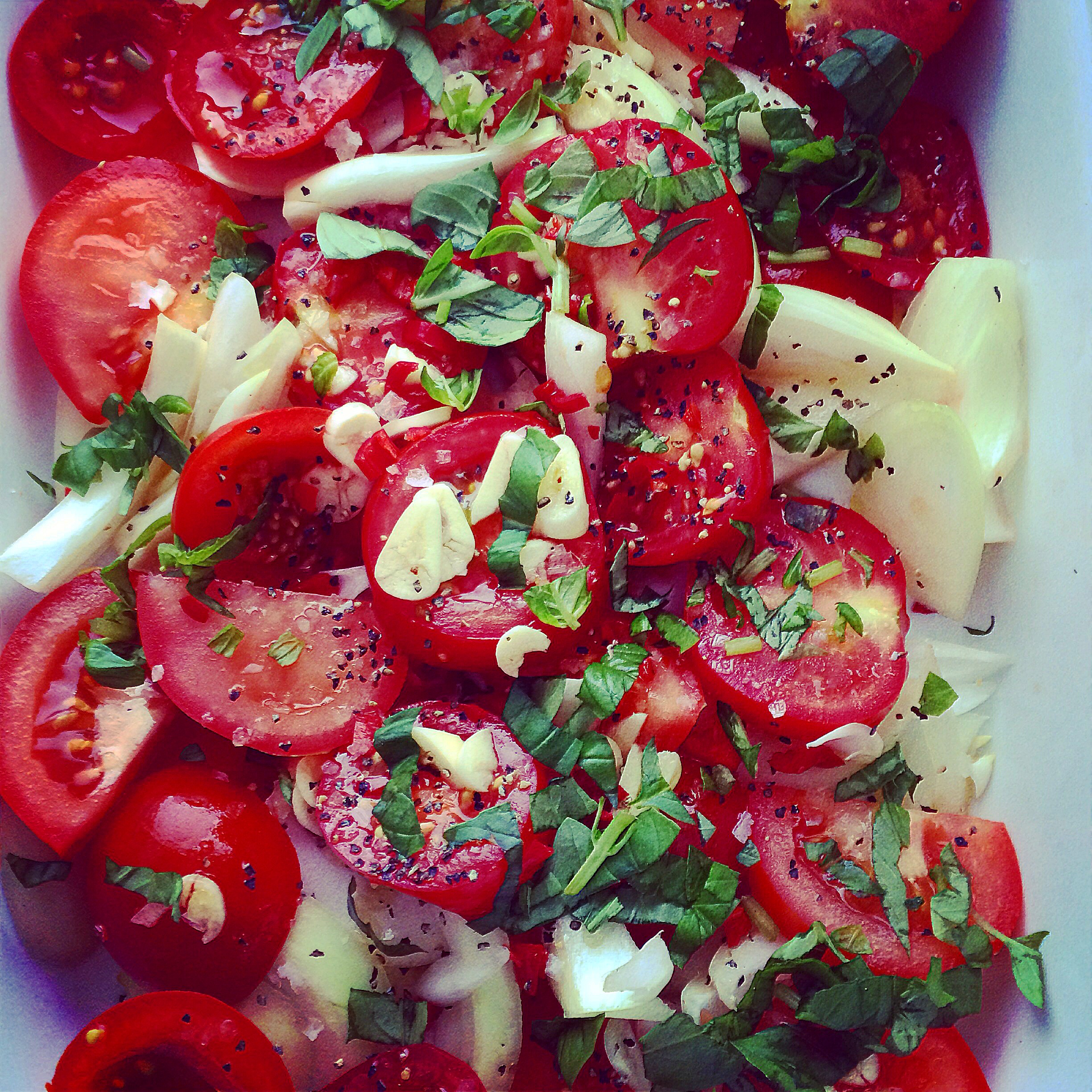 Formen settes i ovnen og stekes på 225 grader i ca 20 minutter til tomatene og løken er blitt myk!