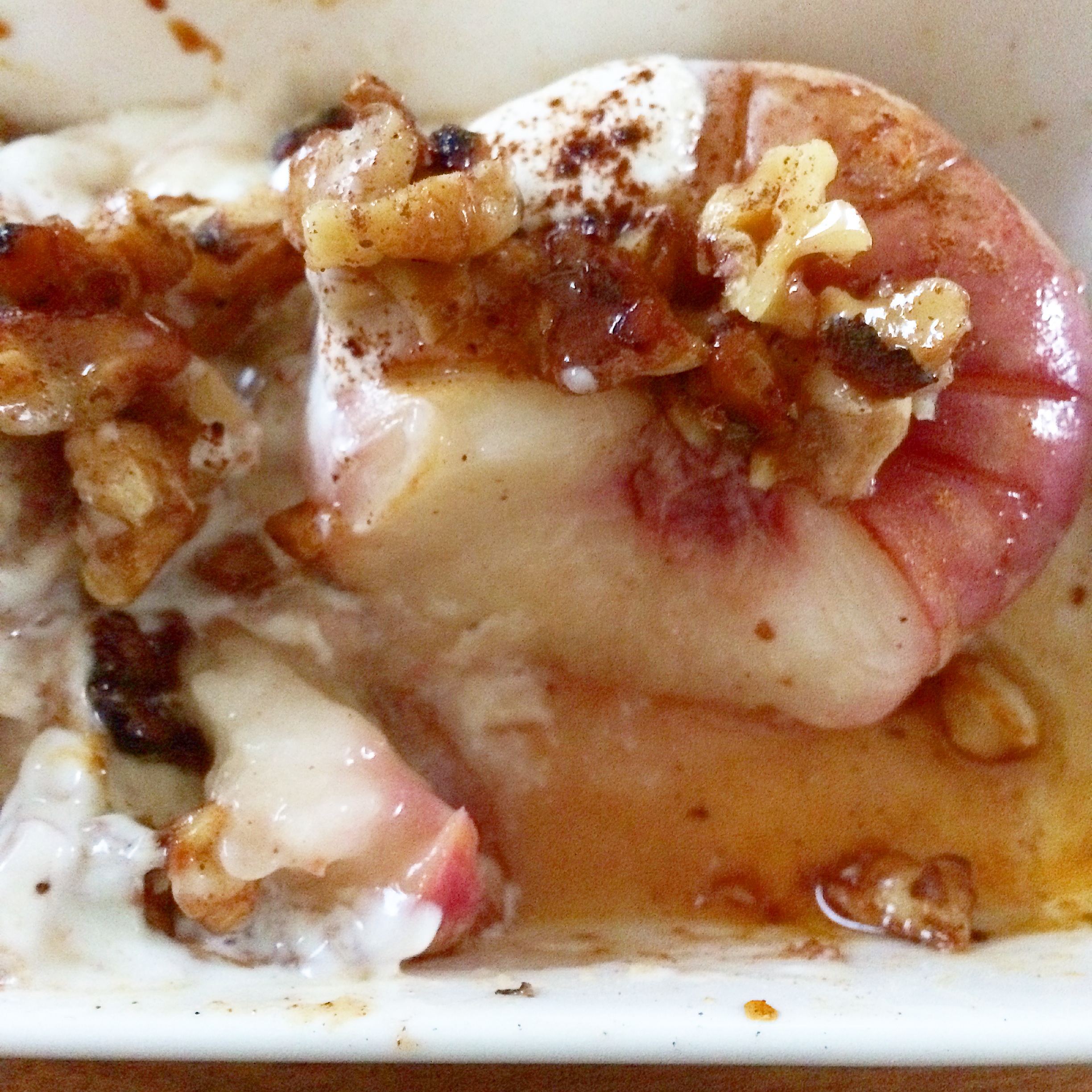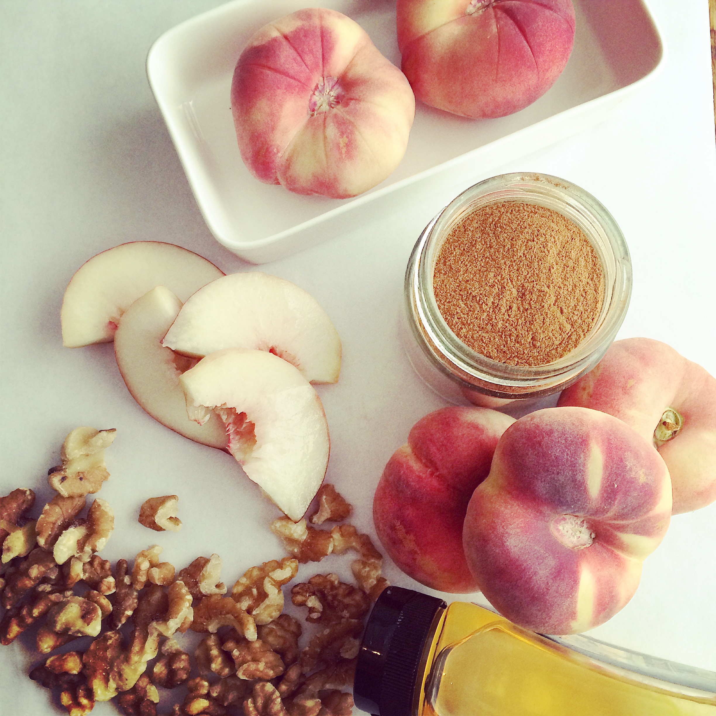 Fersken er søte og gode nå og er perfekt til dessert. Disse flate ferskene bakte jeg i ovnen med litt akasie honning, kanel og nøtter. Super enkelt og veldig godt med is eller vaniljekesam til.