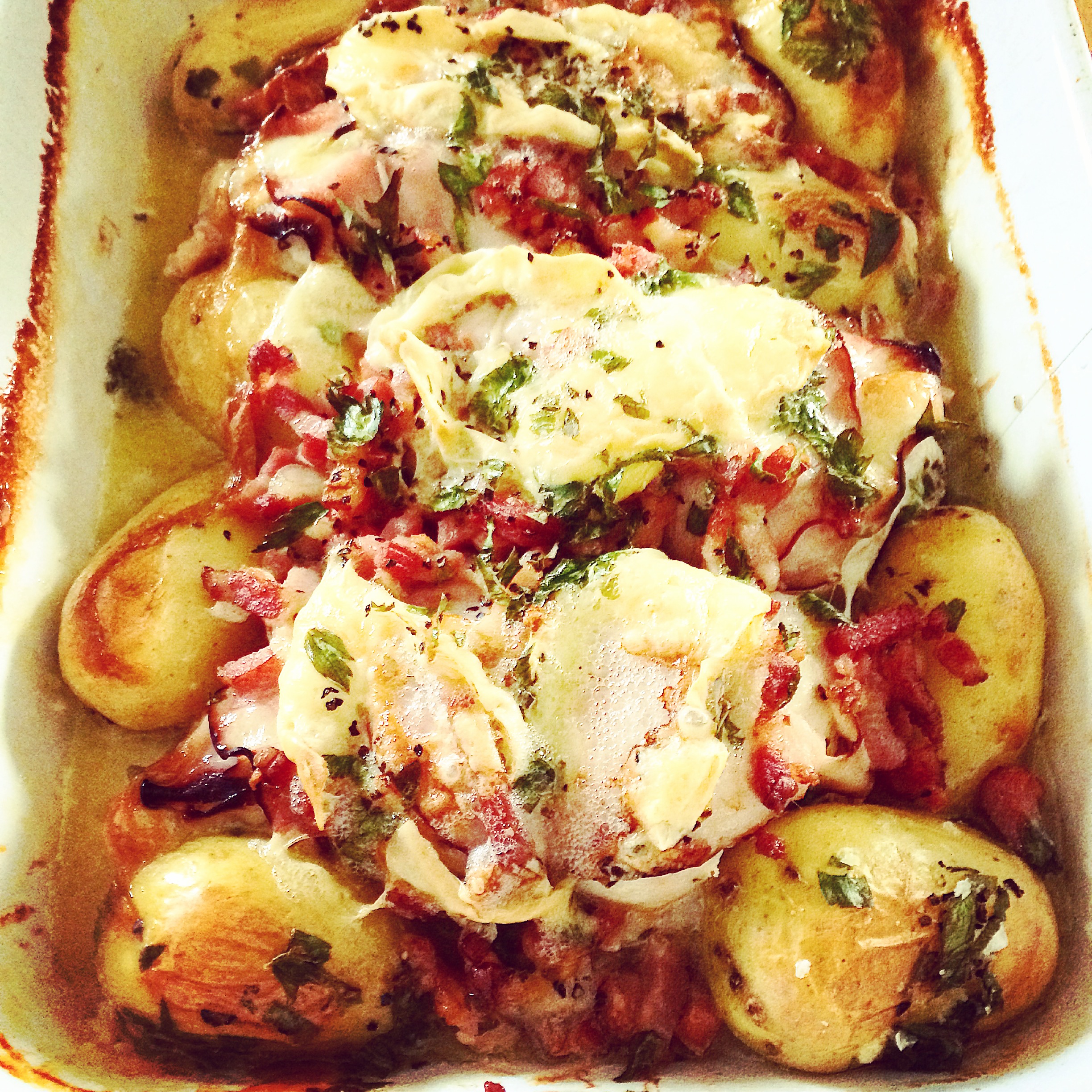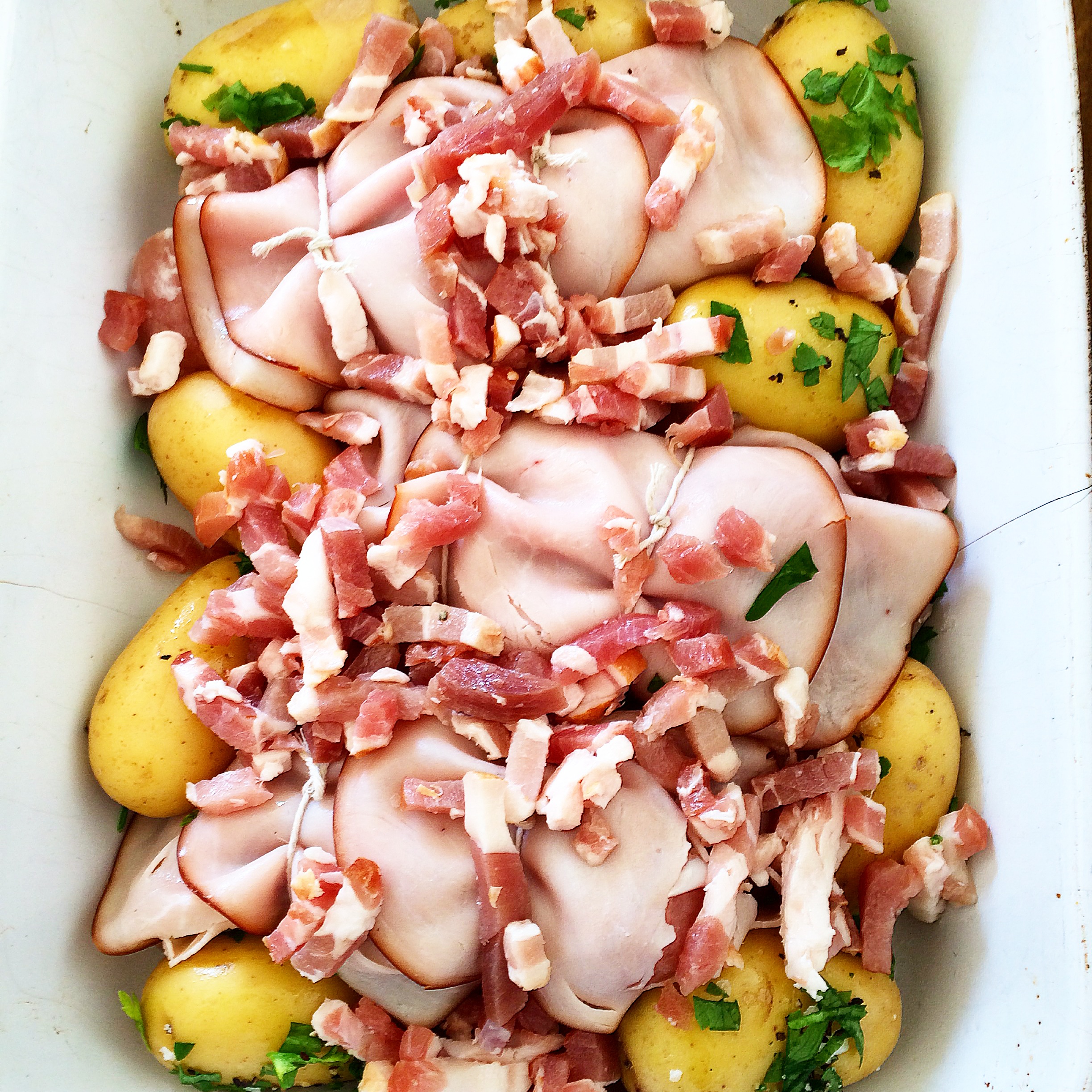 Kyllingfilet kan lett bli tørt, men ved å pakke den inn i skinke og knyte den sammen med hyssing forblir kjøttet saftig. Disse filetene er fylt med god ost, hvitløk og persille. Det er ganske enkelt genialt å legge alle ingrediensene i en form og bake de i ovnen samtidig. Med et hav av gode nypoteter nå, og hvis du velger de minste, er de ferdig stekt samtidig med kyllingen. Litt salt bacon på toppen er med på å lage en god skysaus sammen med osten.