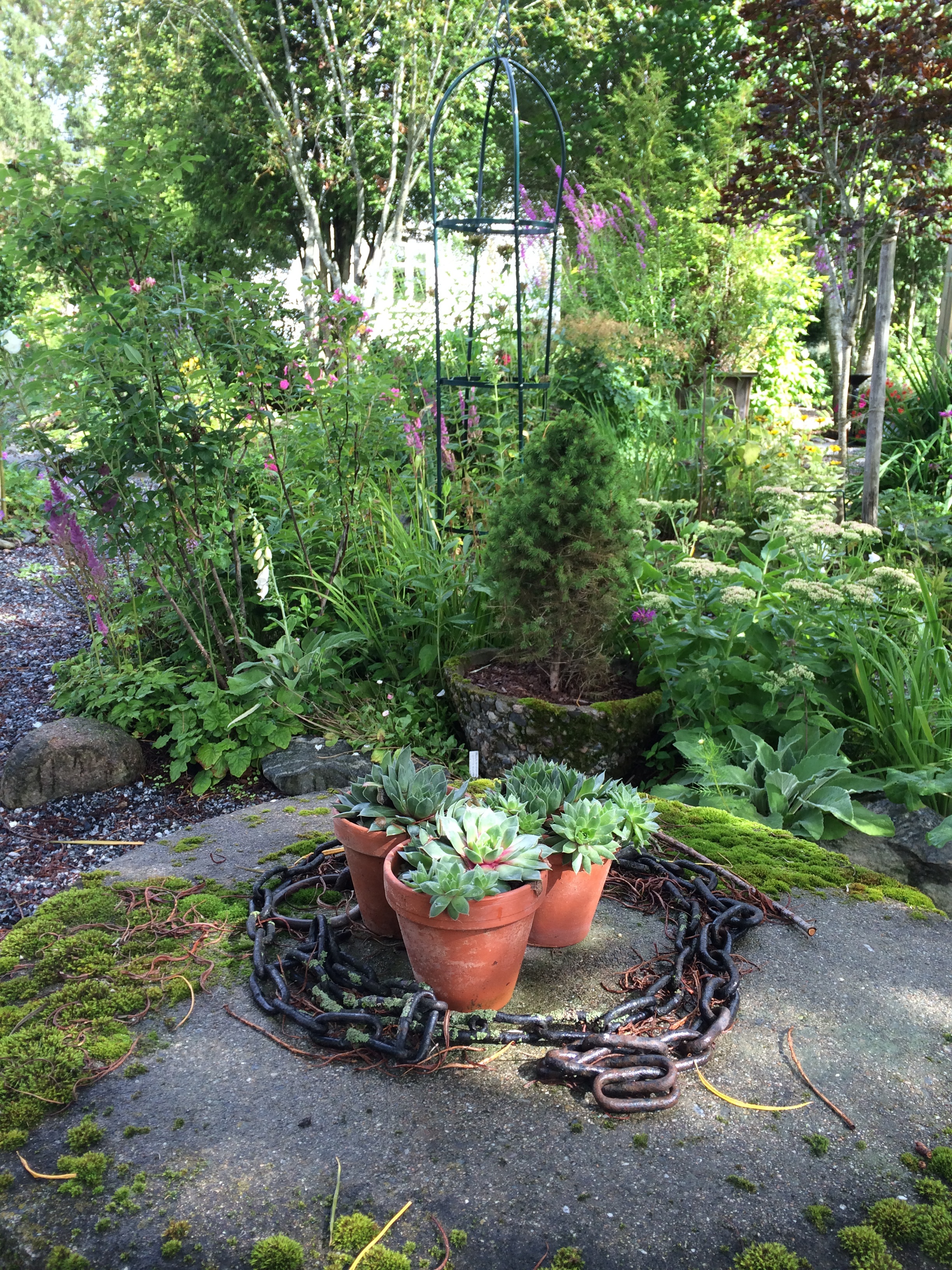 Vi hadde hyggelig selskap på hagevandringen av tillitsfulle katter og hunder på gården. Janne har også et stort utendørsbur med nymfeparakitter som plystrer villig tilbake.