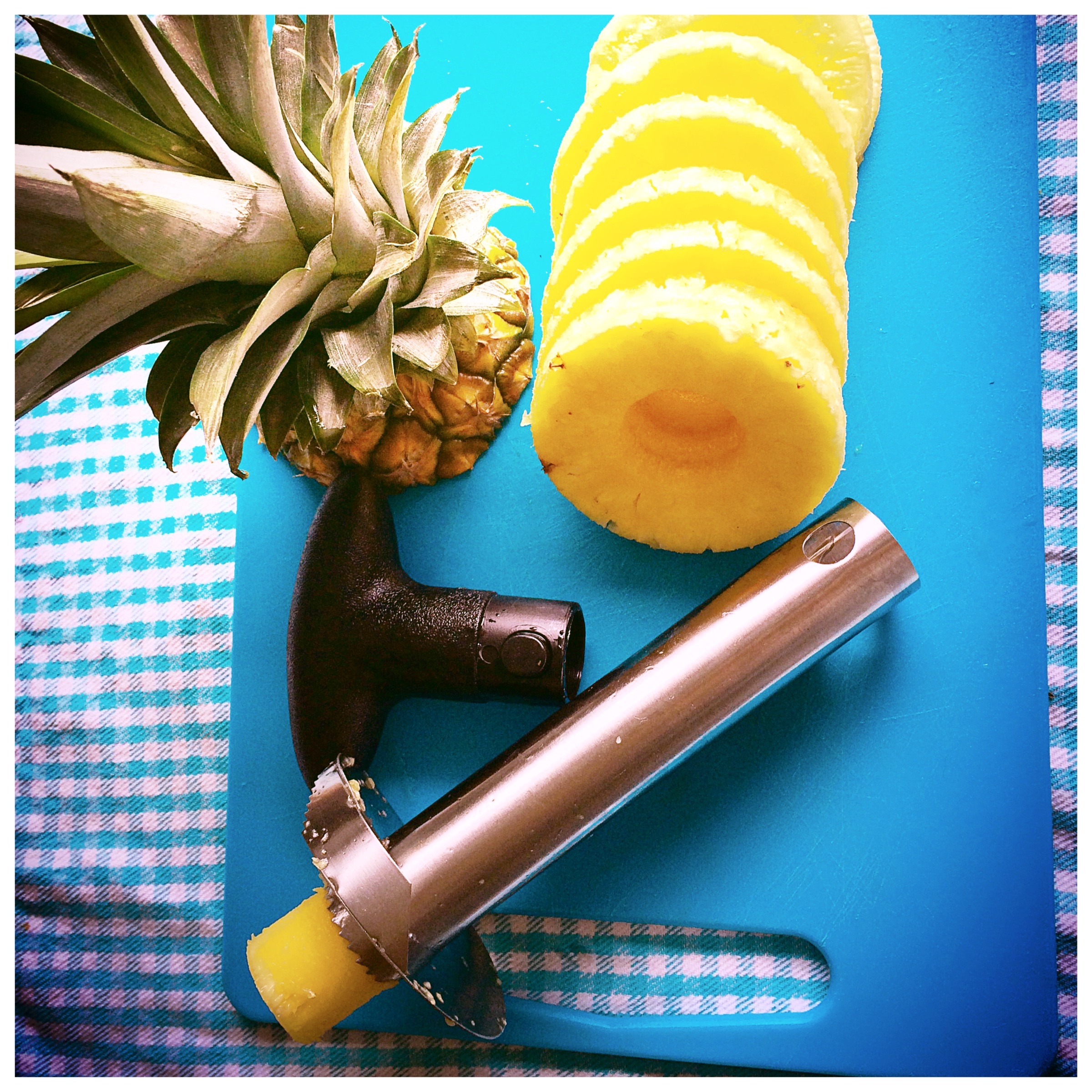 Jeg kjøpte denne artige ananas-skrelleren på coolstoff.no for 79 kroner. Den funker kjempe bra. Du får flotte ringer. Skjær av topp og bunn. Sett kutteren på toppen og skru deg nedover. Kjempe enkelt!