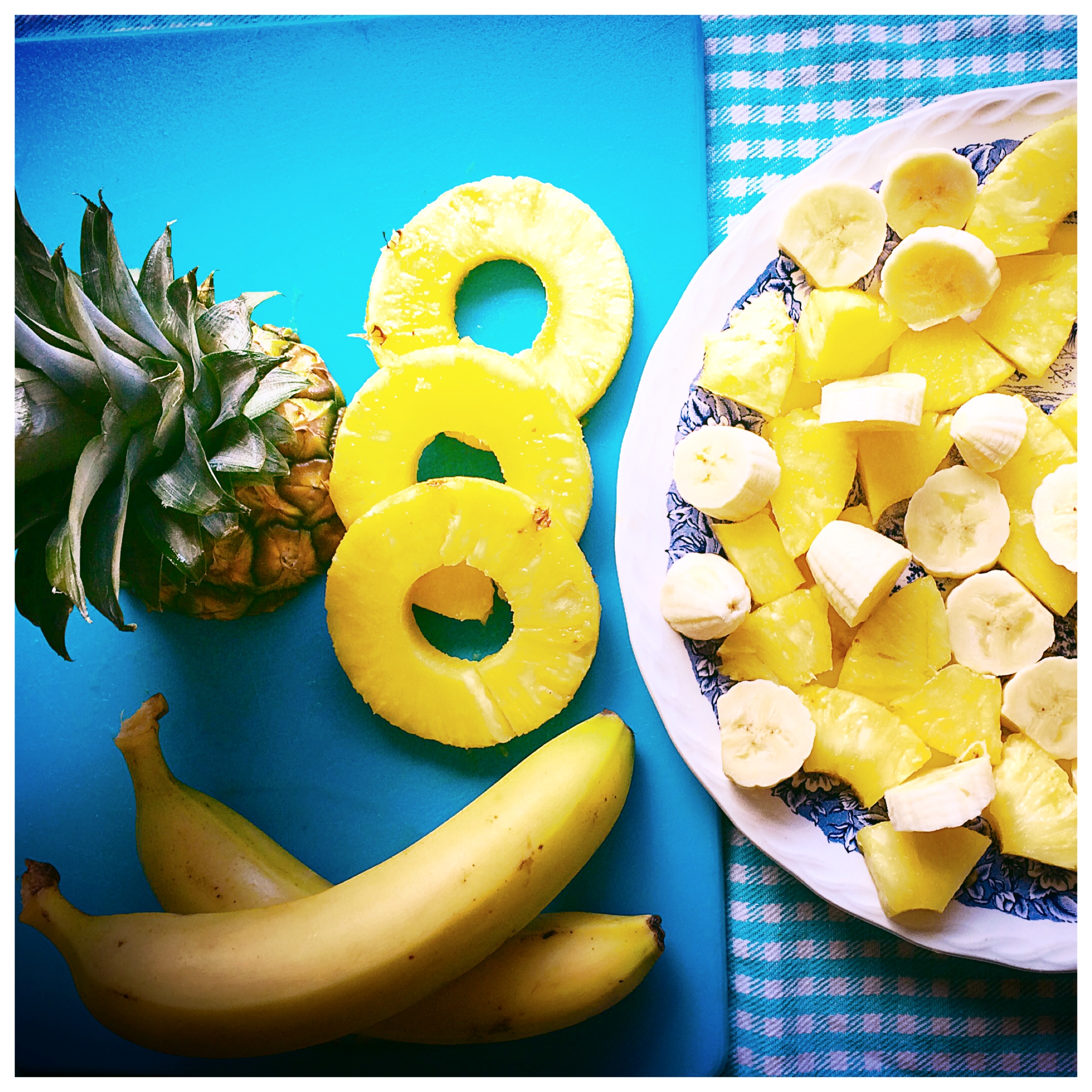 Skjær ananas og banan i passe tynne biter. Ca 2 cm høye. Legg de på en flat tallerken og sett de i fryseren i 30 minutter.