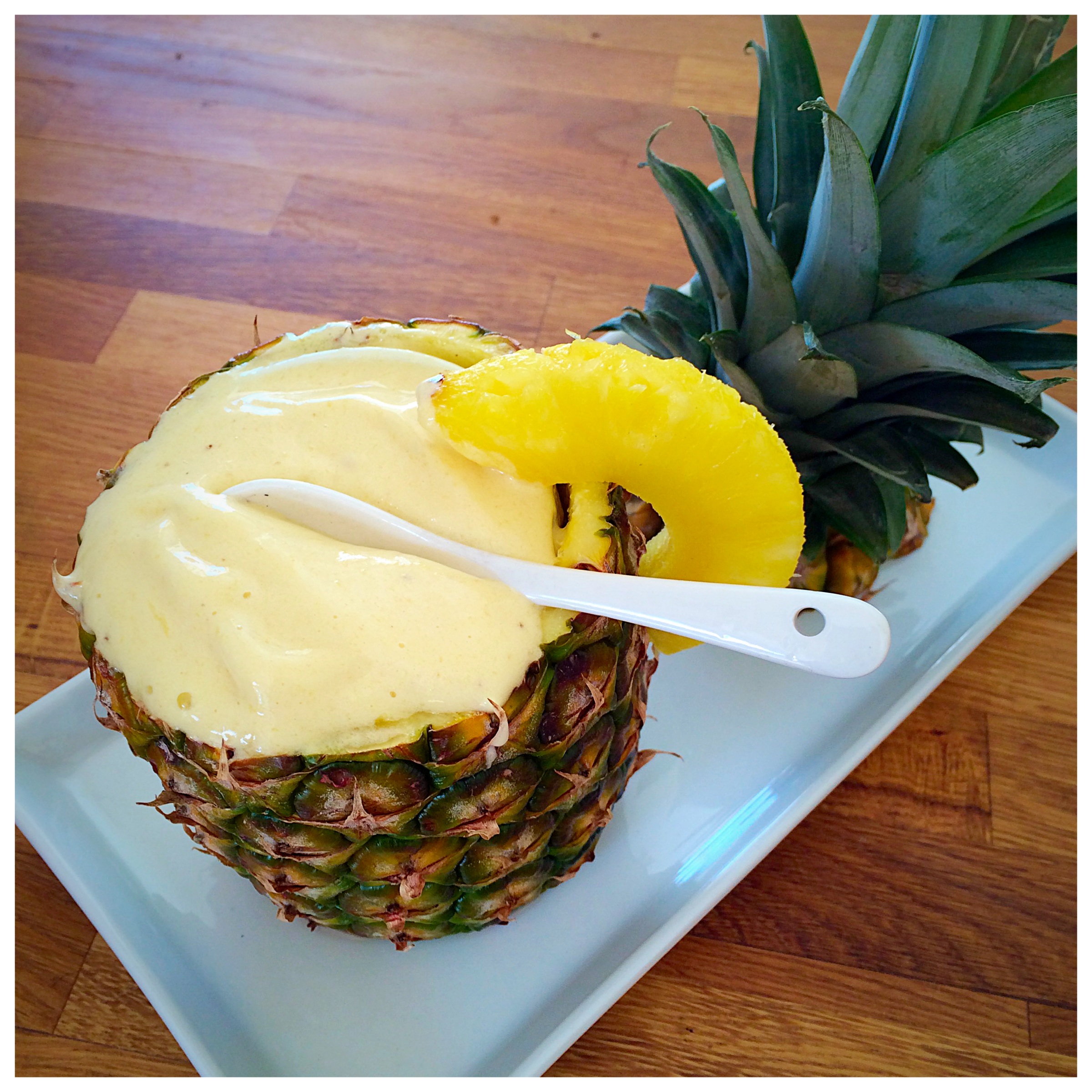 Det hule ananas skallet kan du bruke til å servere isen i 😉