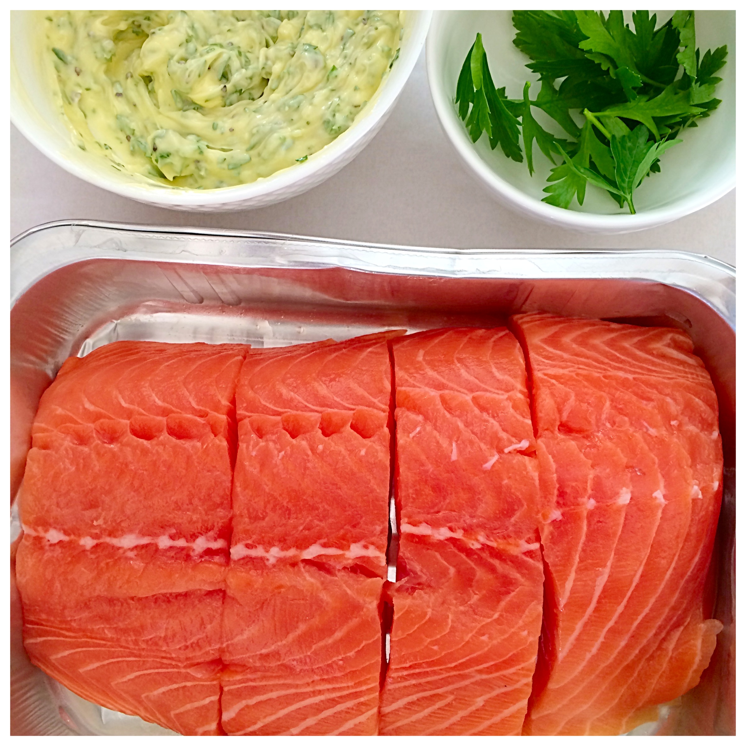 Bre 2/3 av persillesmøret over laksefiletene og sett laksen i ovnen i 18-20 minutter.