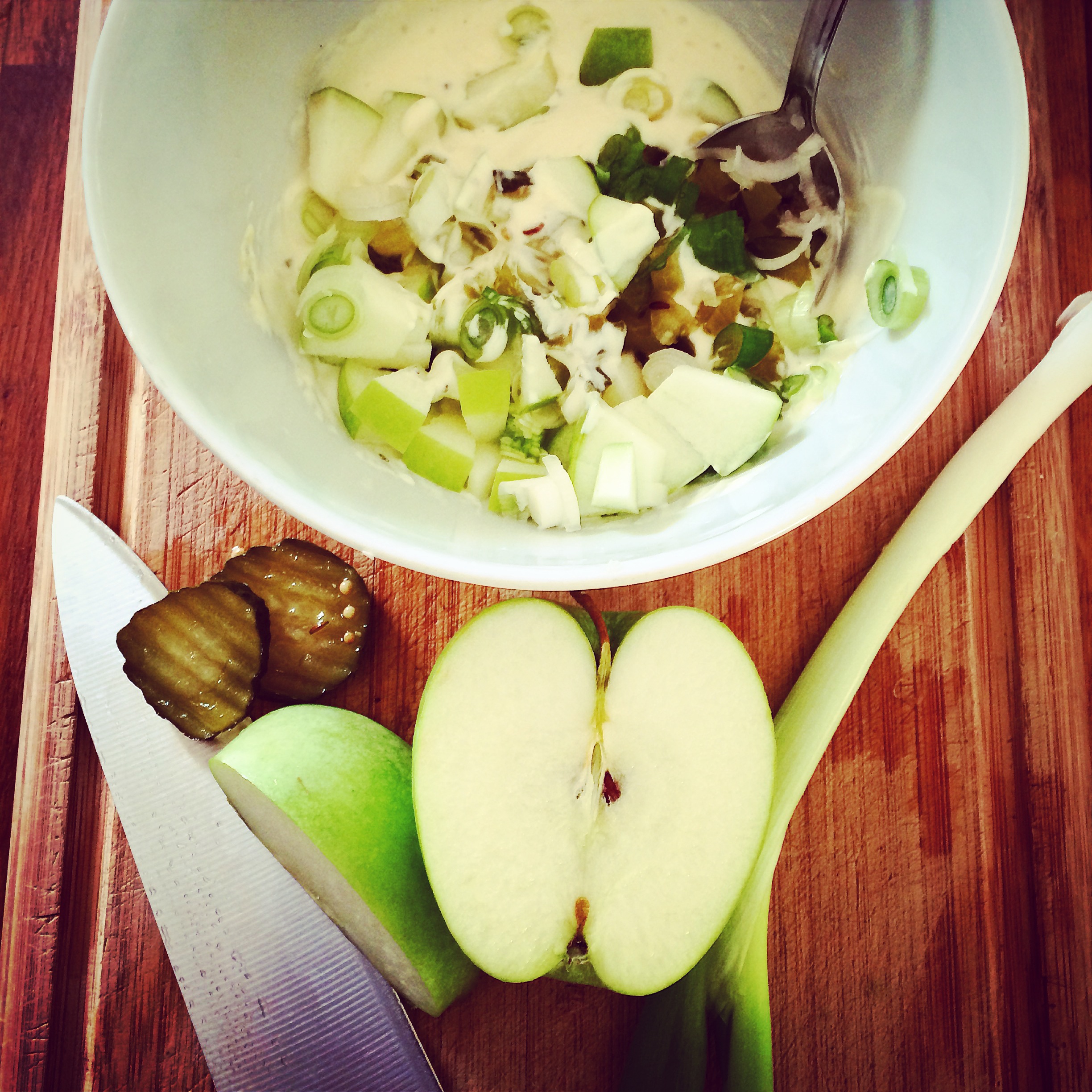 Bland sammen majones, rømme og sennep. Finhakk sylteagurk, skjær eplet i passe små biter og vårløken i tynne skiver. Bland alt sammen med selleriroten og smak til med salt og pepper. Dropper du sylteagurken kan du godt ha i litt limesaft for syrens skyld.
