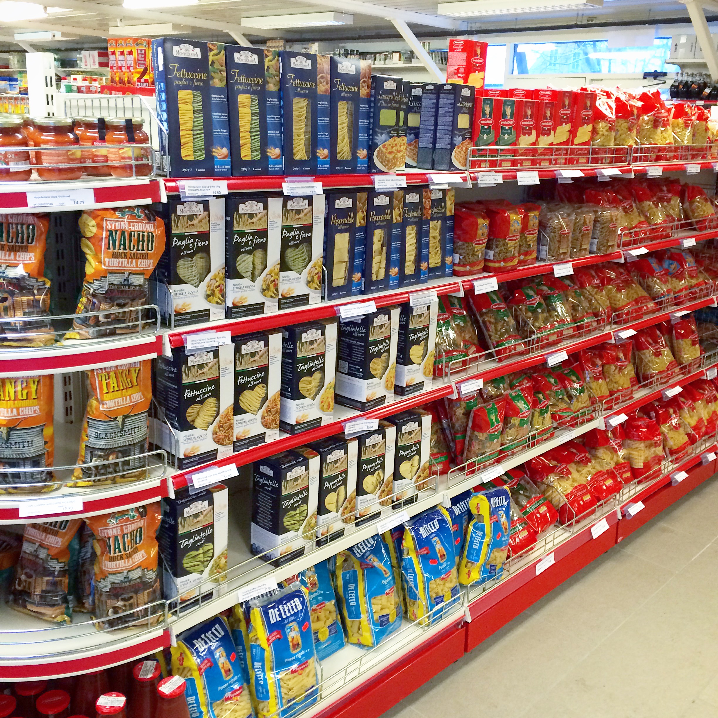 Rett innenfor døren har du en hel reol med pasta i alle ulike farger og fasonger. Den dyreste typen (som slettes ikke var så dyr), av merket Montegrappa, er produsert på en slik måte at den kan varmes opp igjen uten å bli sticky. Matland har også mange ulike typer av pastaZara som er markedsleder på pasta i verden.