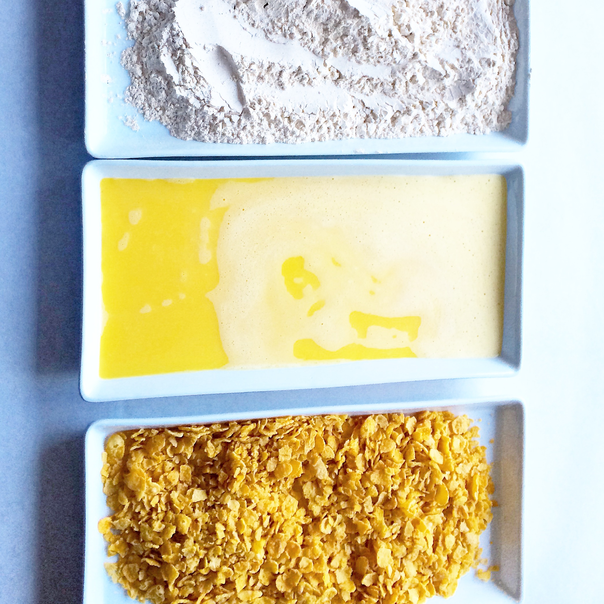 Rør sammen maizena, bakepulver og krydderne og ha på en flat tallerken.