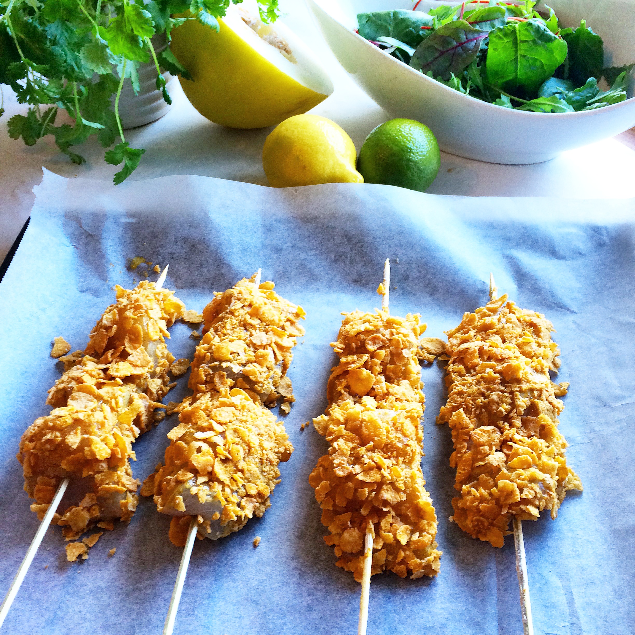 Disse fiskespydene er bare noe av det diggeste jeg har spist. Seien i seg selv er en nydelig og smakfull fisk, men disse sprøe fiskespydene smaker himmelsk av karri, cayenne og cornflakes, uten å være sterke. Sammen med en enkel aioli og en frisk salat av baby leaf, honningmelon og koriander tror jeg virkelig man treffer innertier’n både hos små og store.