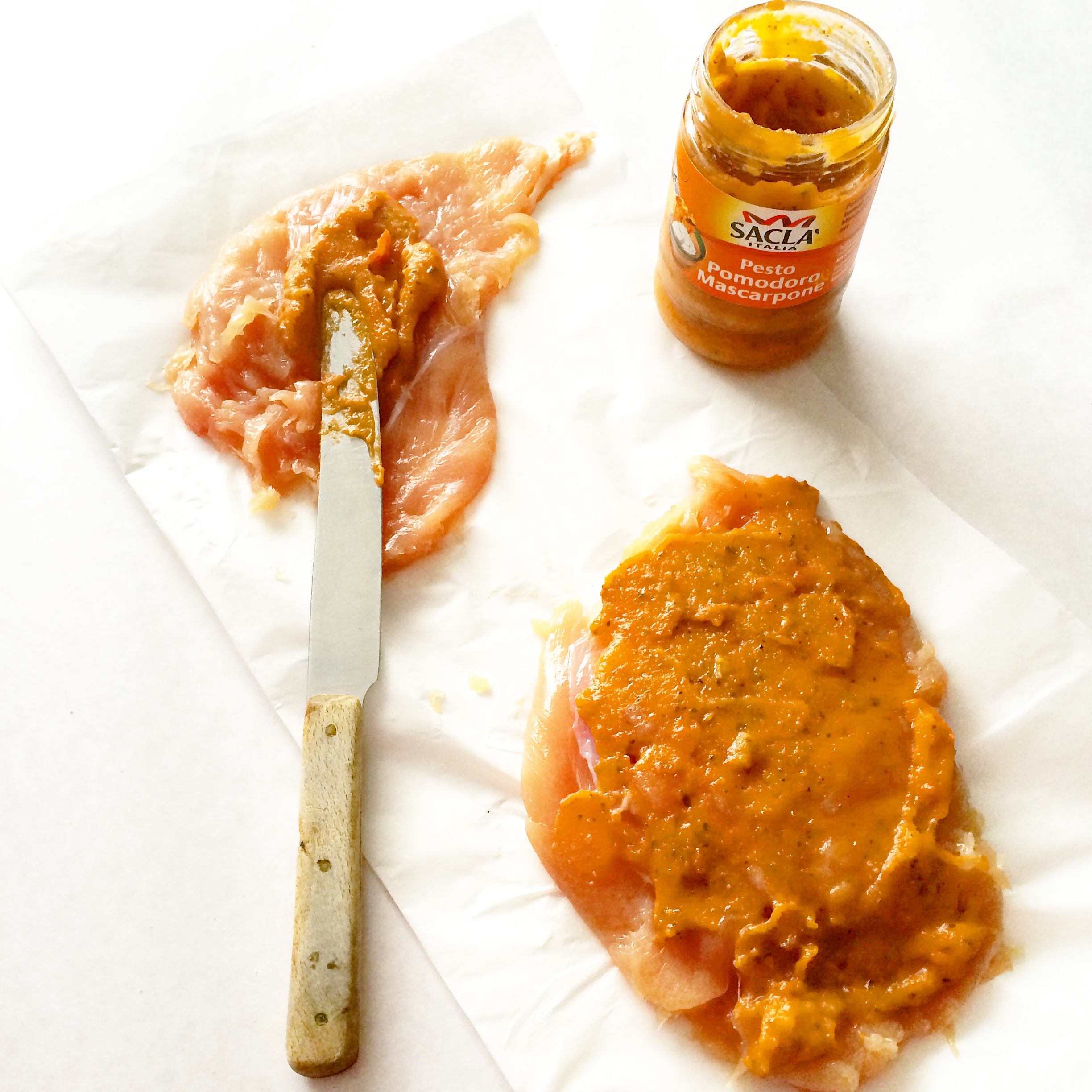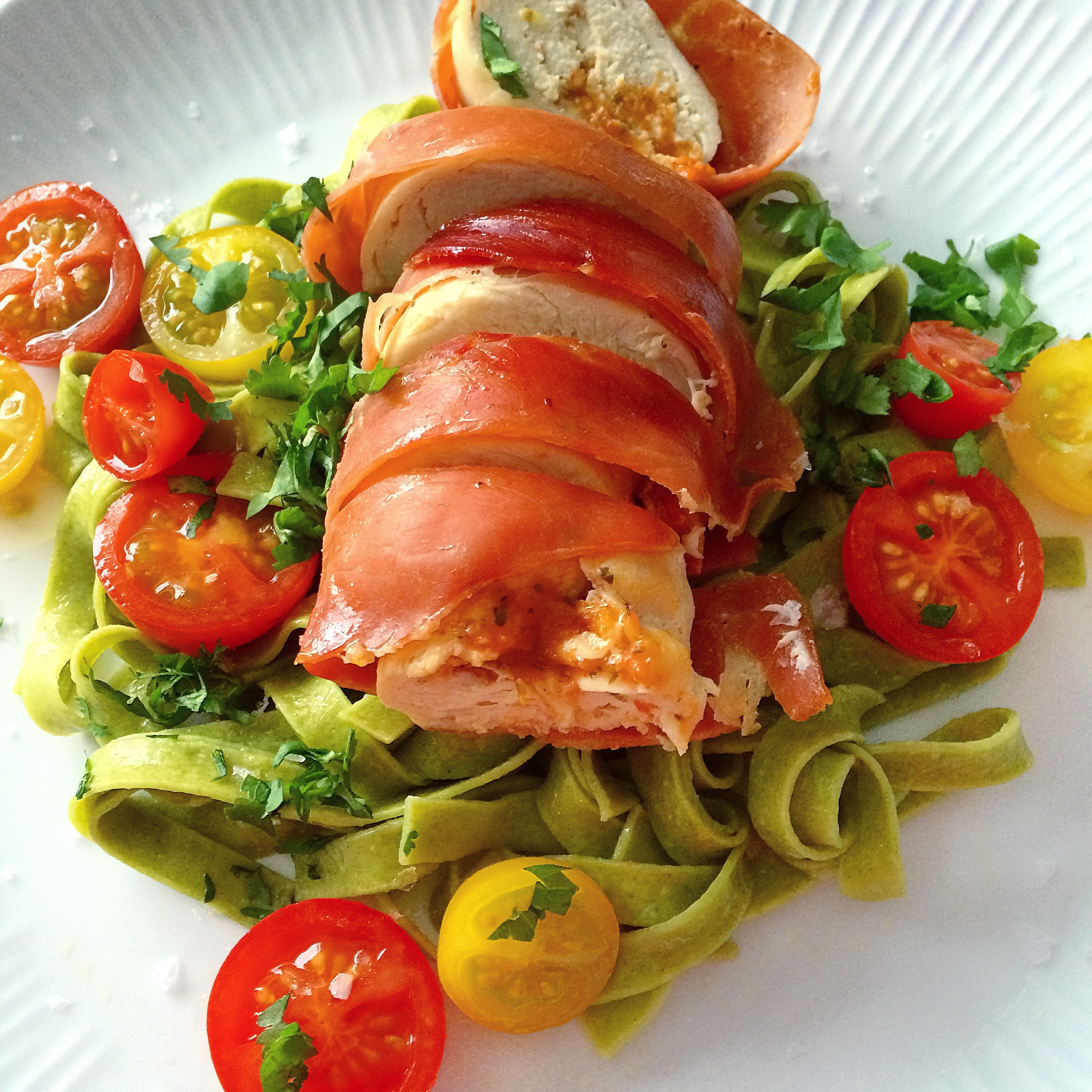 Dette er en deilig hverdagsmiddag på 30 minutter av kyllingfilet innrullet i smakfull pesto av pomodore tomater og mascarpone ost innpakket i Serrano skinke.