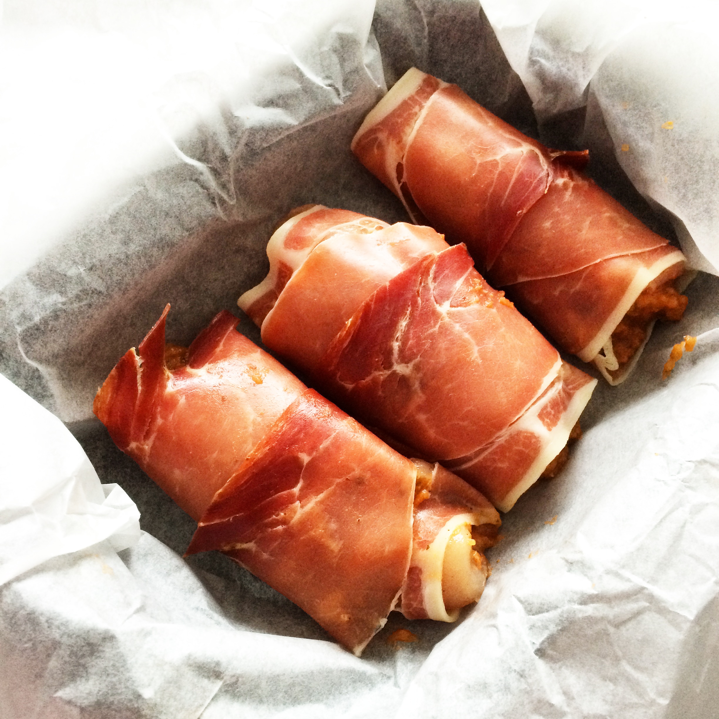 Bank kyllingfileten flat før du smører på saus, ruller den sammen og pakker den inn i skinke. På denne måten beholder du saften i kyllingkjøttet og det trenger ikke mer enn 20-25 minutter steketid. Resultatet er et saftig stykke kjøtt med mye smak.