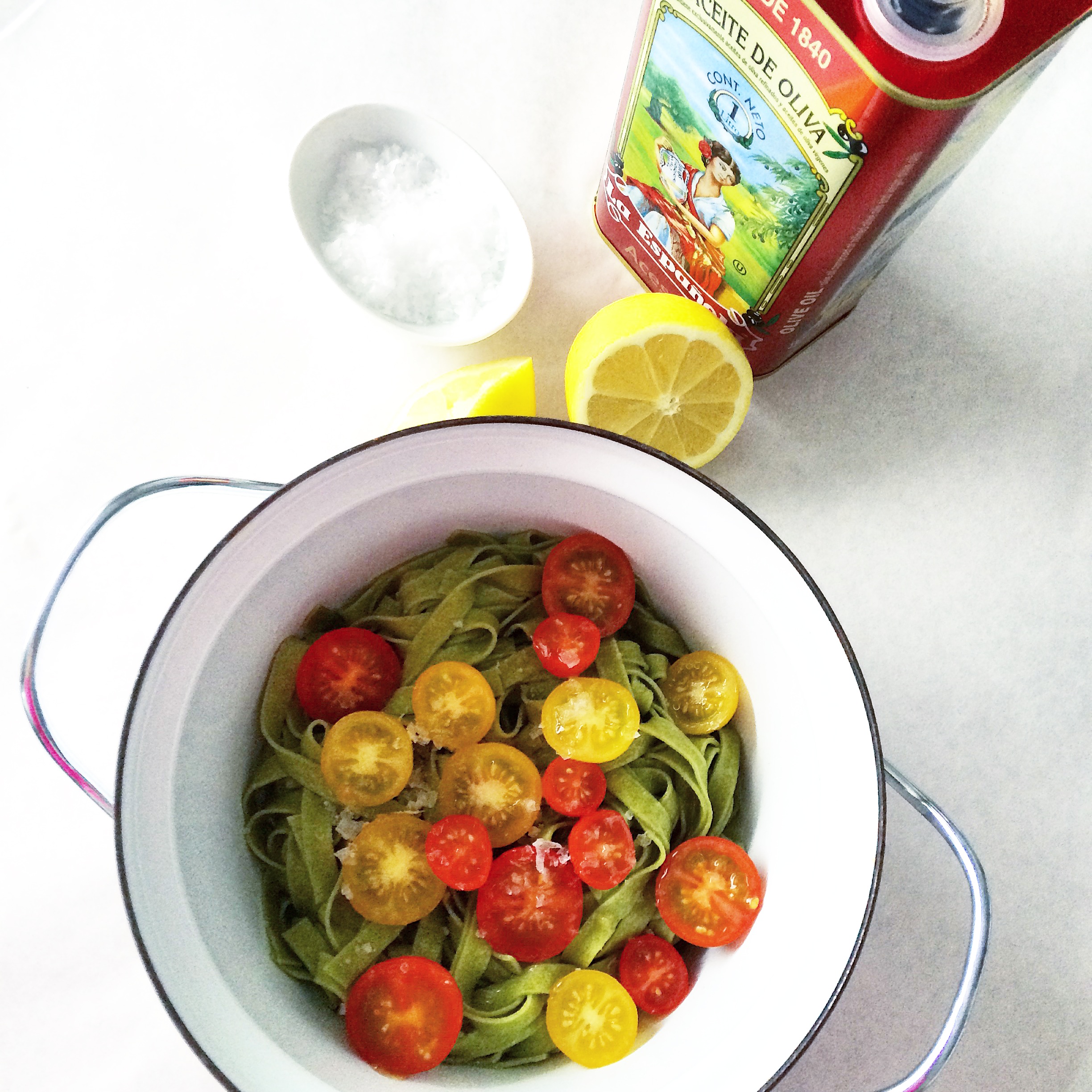 Hell av pastavannet i et dørslag og ha tagliatellen tilbake i kjelen. Ha i en god skvett olivenolje, saften av en halv presset sitron, en dæsj salt og tomatene. Rør godt rundt. Jeg synes denne pastaen var så god at jeg nesten bare kunne ha spist denne retten slik.