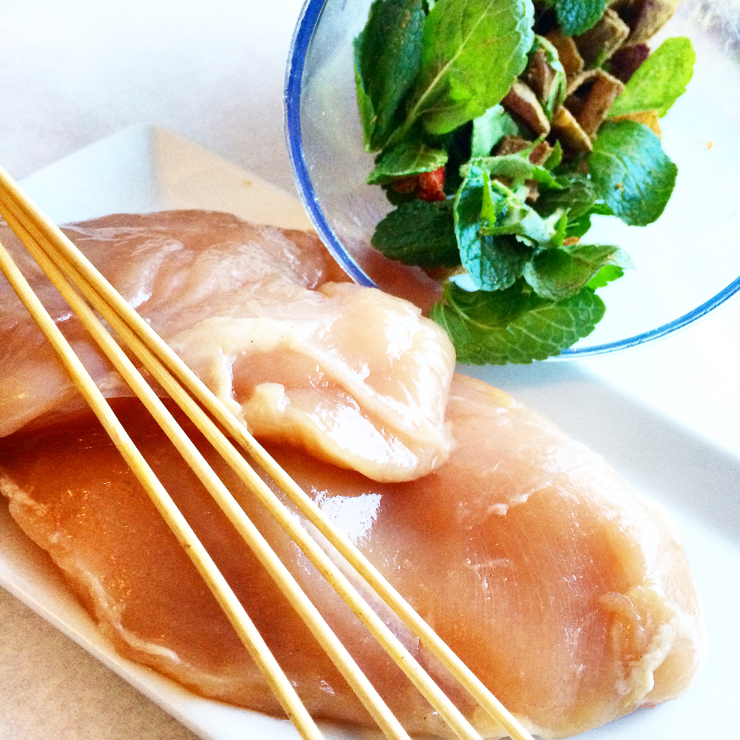 Del kyllingfileten på langs og tre på grillspydet.