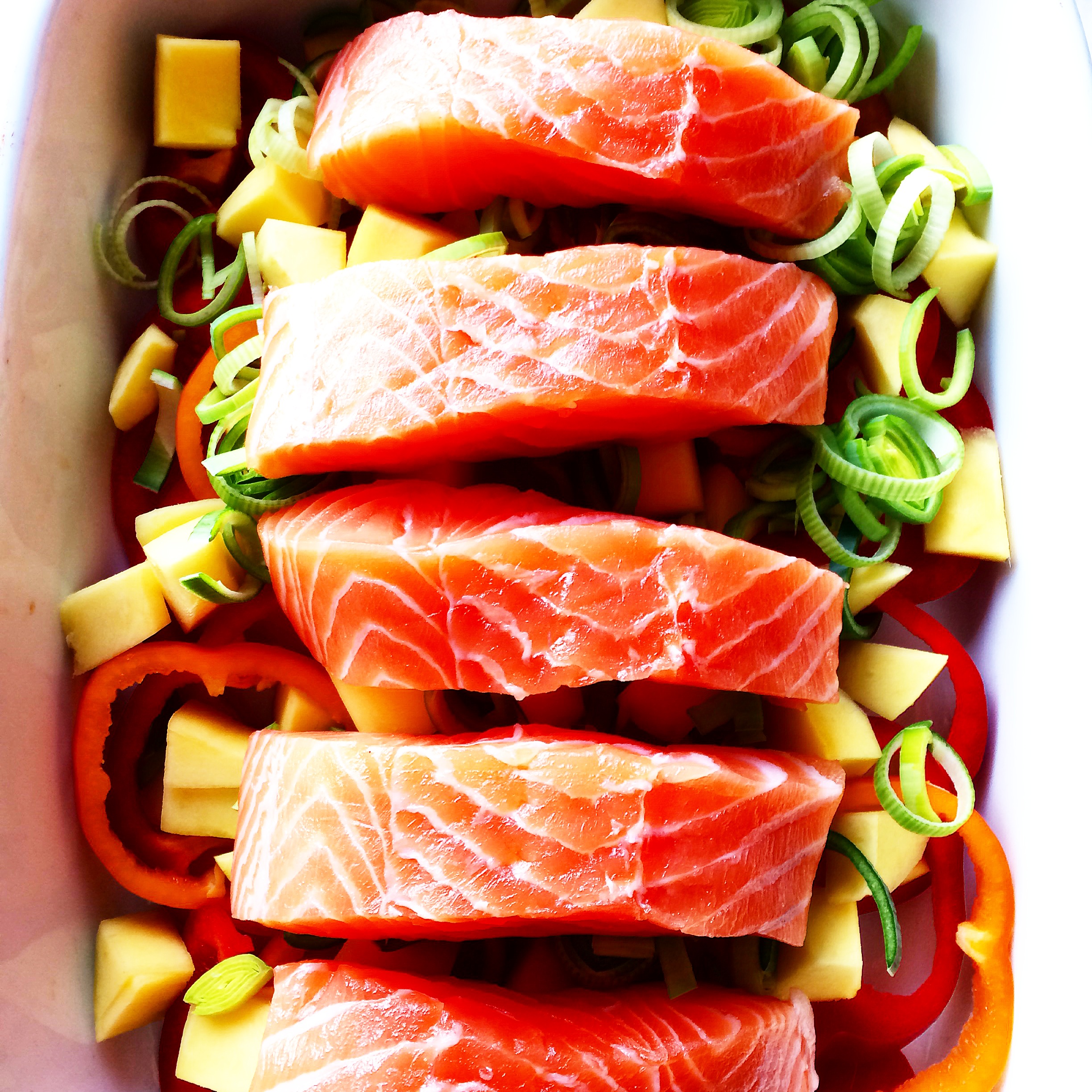 Dette er en enkel og rask laksemiddag med mye smak. Korma saus er mild og god, men du kan godt tilsette ekstra chili for å gjøre den litt sterkere. Søtt og sterkt er en forfriskende kombinasjon. Med frisk mango og sprø paprika blir dette garantert en hit blant de aller yngste i familien. Guttungen her i huset forsynte seg 3 ganger 🙂