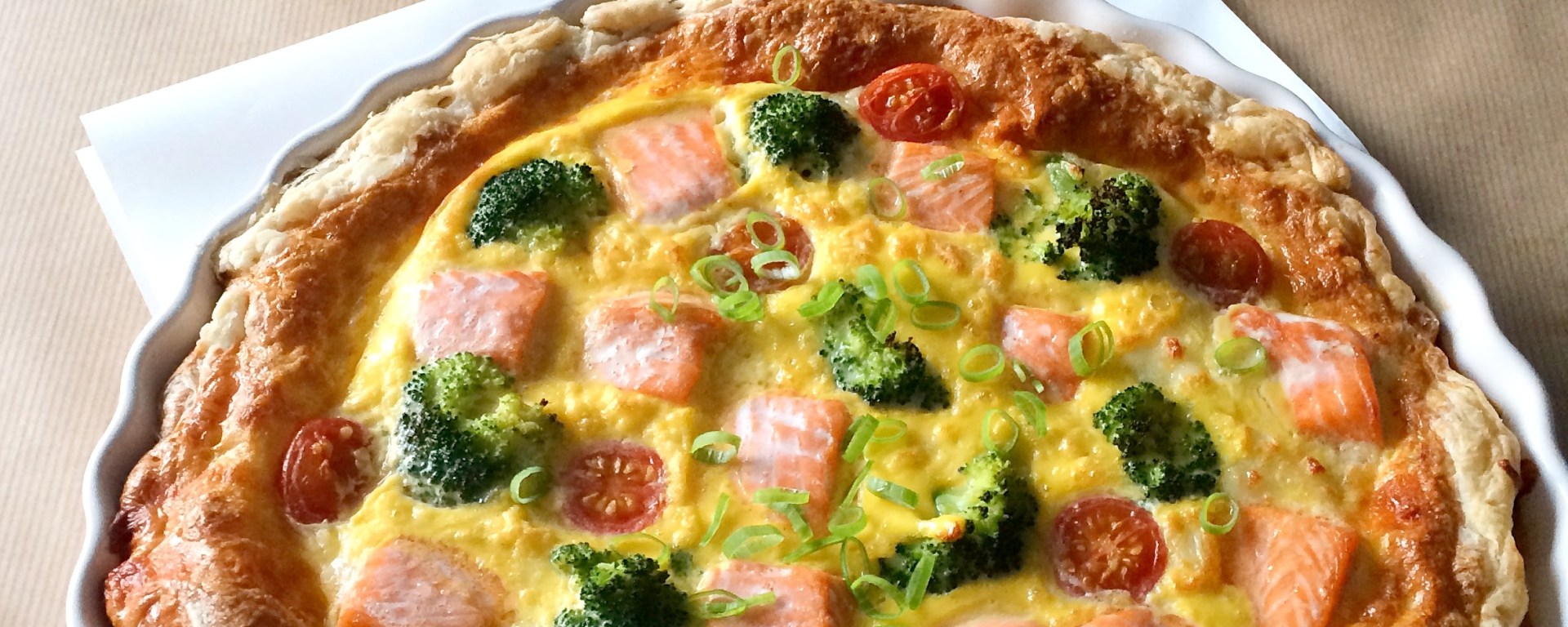 Skjær ørreten i biter på ca 3×3 cm og fordel i paien sammen med halve tomater og blomkålbuketter. Jeg var redd det ble for lite væske og pisket sammen et 6. egg og en skvett fløte, men væsken og osten eser under steking og hever seg opp mellom fisken og grønnsakene. Min måtte stå 7 minutter ekstra for å bli stiv i midten og derfor litt ekstra godt stekt…