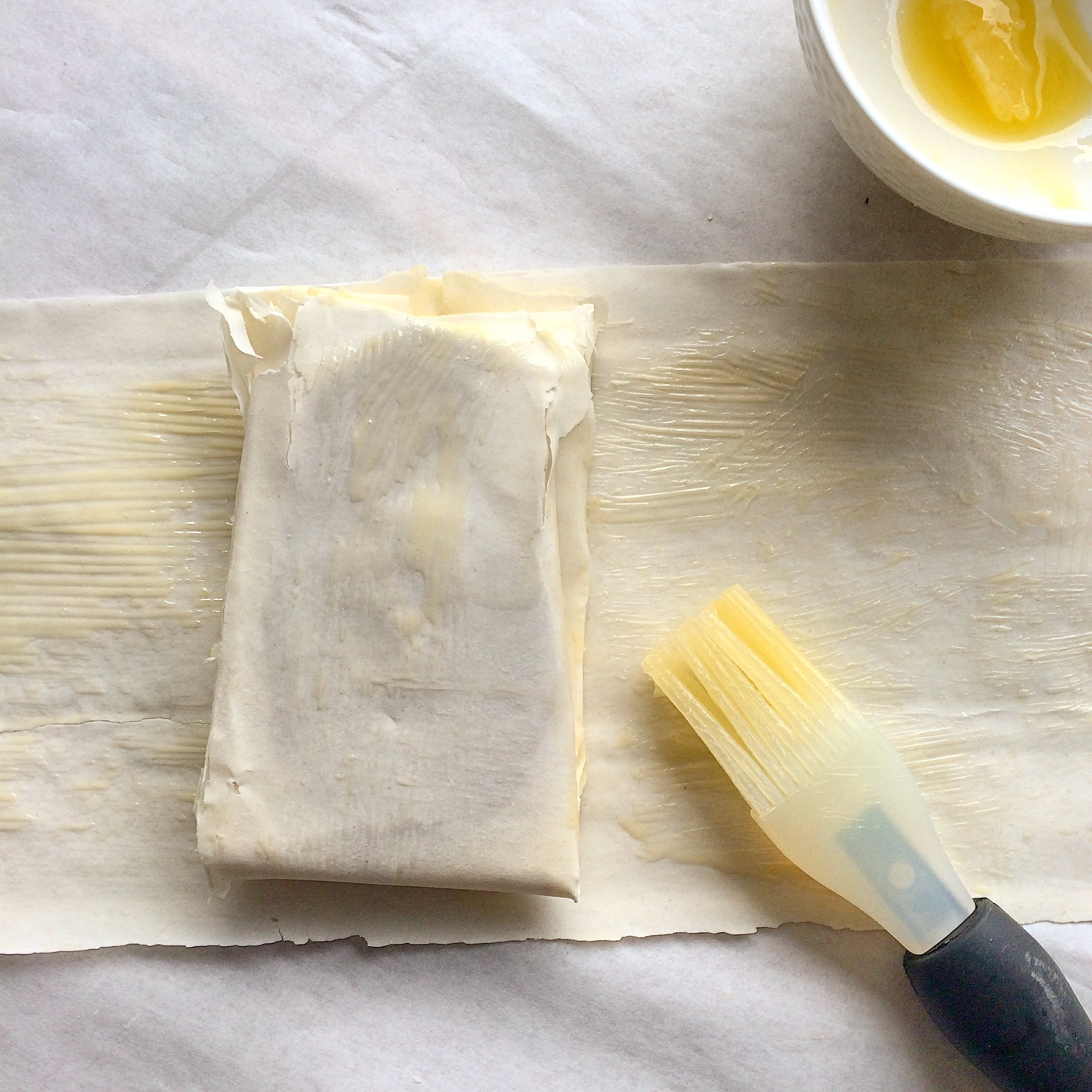 Bruker du filodeig lønner det seg å smelte litt smør og pensle litt mellom arkene av filodeig eller får å legge skjøtene inntil.